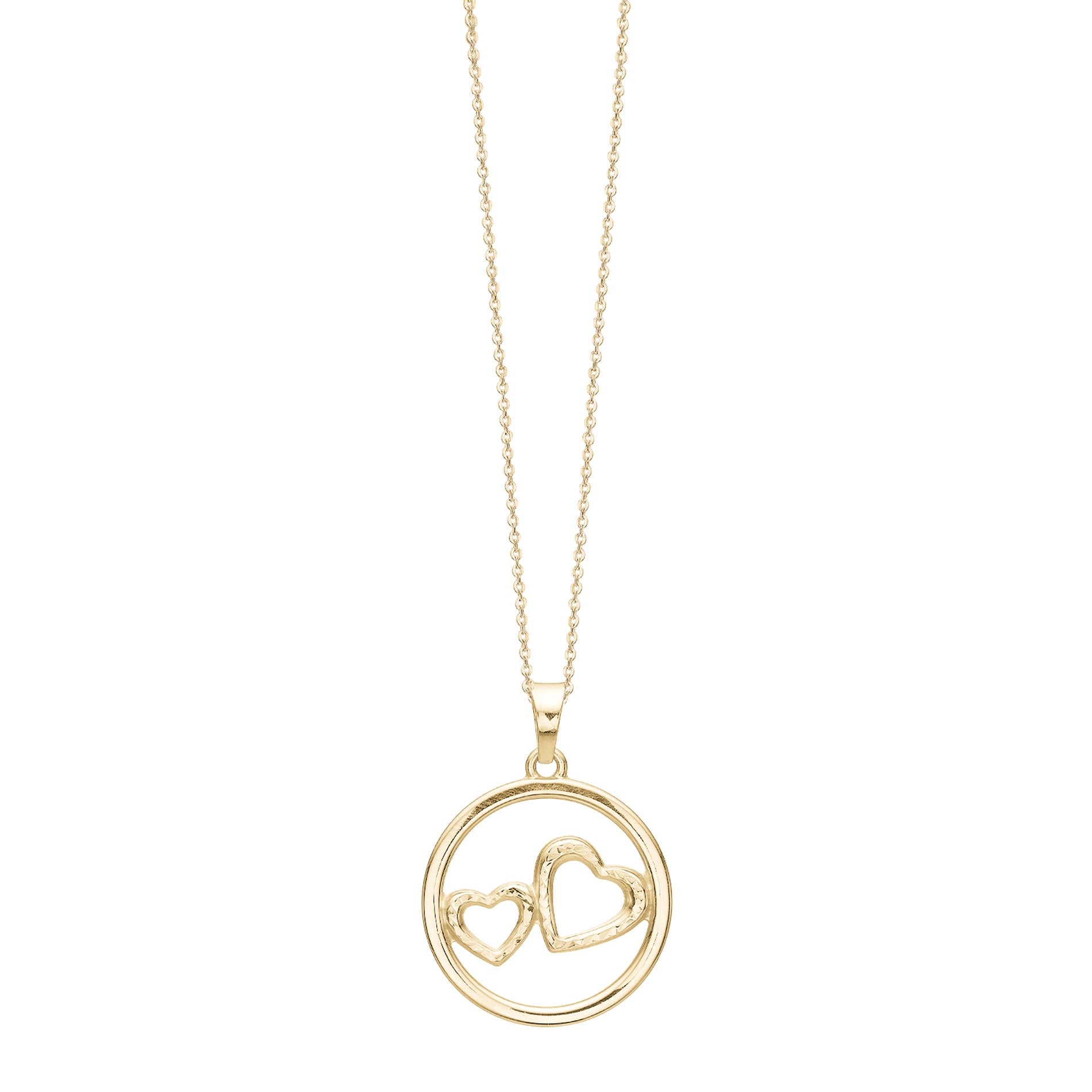 Aagaard To Hjerter i En Ring Vedhæng i ægte 8 karat guld er en smuk manifestation af kærlighed og enhed. To hjerteformer, omfavnende i en evig cirkel, symboliserer en uendelig forbindelse. Dette betagende vedhæng leveres komplet med en forgyldt kæde og er det ideelle udtryk for tidløs elegance og kærlighed.