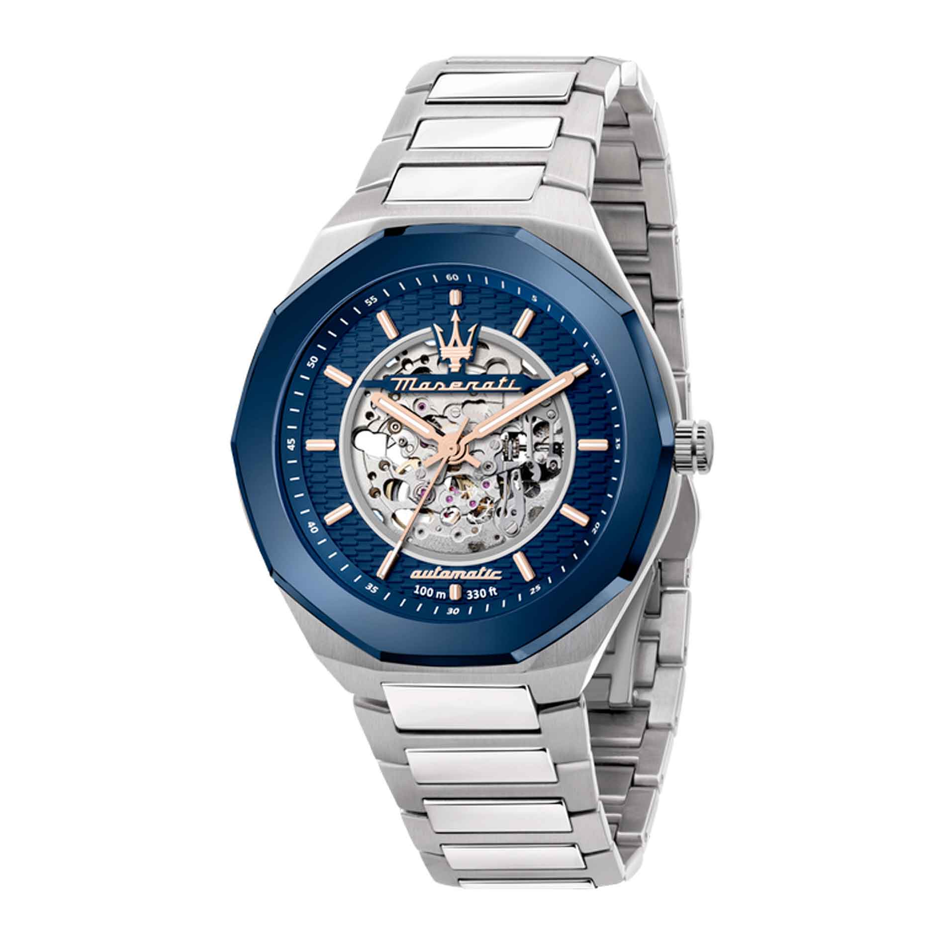 Maserati præsenterer et mesterværk med ur - et automatiske skeletonur designet med en lidenskab for sofistikeret urmageri. Den sølvfarvede urkasse og den matchende rustfrie stålrem giver et indtryk af klassisk elegance. Den blå urskive og urkrans tilføjer et moderne twist til dette tidløse design. Uret er udstyret med et pålideligt automatisk urværk, og den transparente bagkasse afslører den komplekse skeleturskive. Safirglasset sikrer klarhed og holdbarhed, mens butterfly-låsen giver ekstra bekvemmelighed. Med en diameter på 45 mm, vandafvisende op til 10 ATM og Lumen-funktion er dette Maserati-ur et imponerende statement af luksus og håndværk.