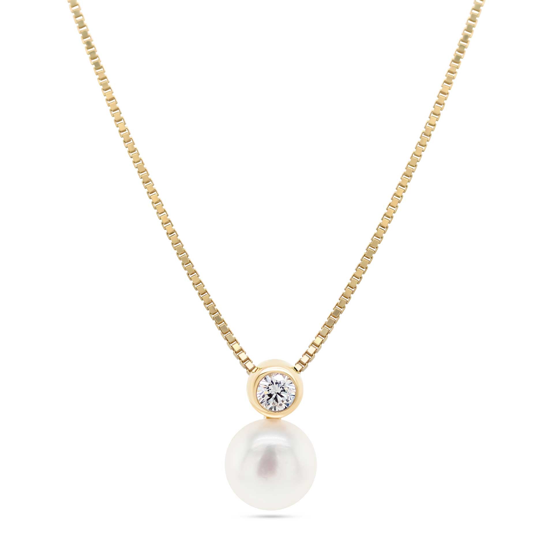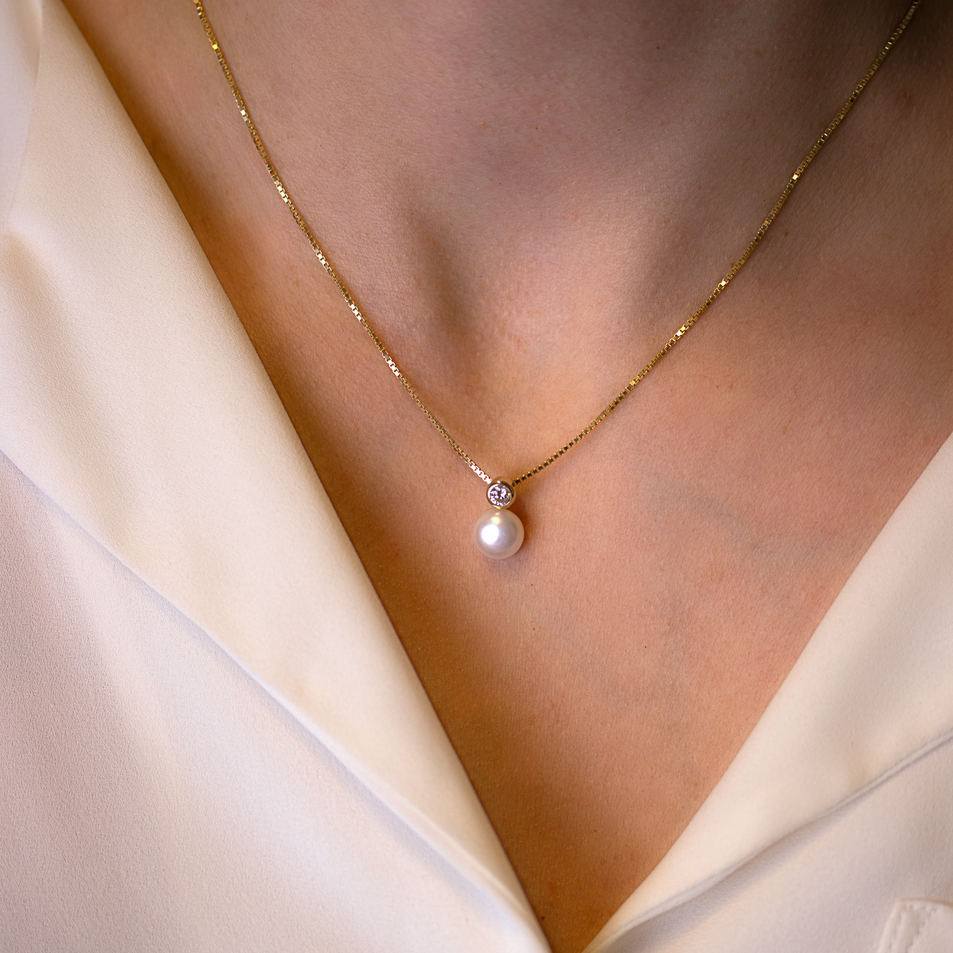 Athen vedhænget i 8 karat guld kombinerer elegance og tidløs skønhed. En strålende hvid zirkonia sten er smukt placeret over en klassisk hvid ferskvandsperle, hvilket skaber et sofistikeret udtryk. Vedhænget leveres med en forgyldt sølvkæde, der komplementerer designet perfekt. Et ideelt smykke til at fremhæve dit look, uanset om det er til hverdag eller fest.