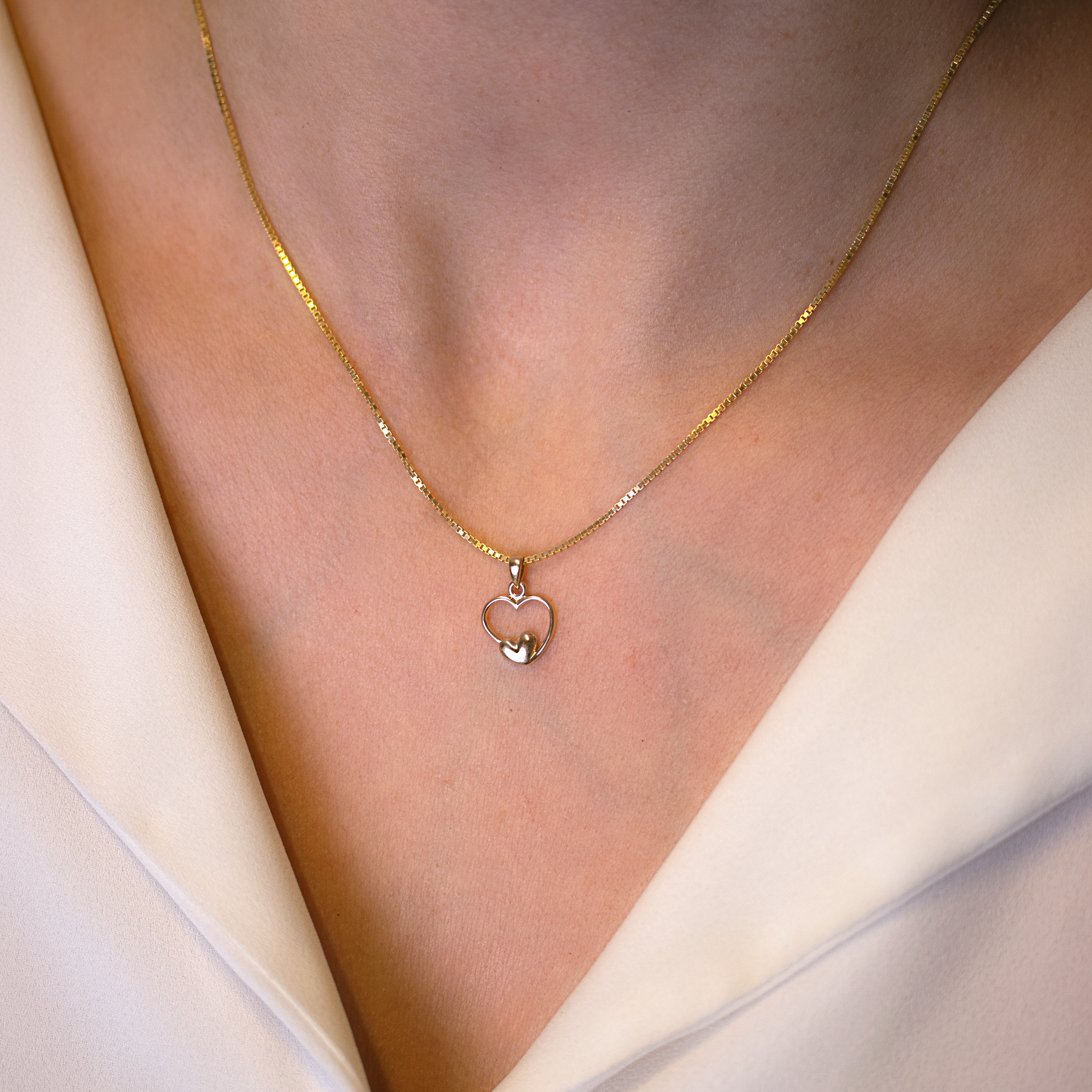 Carry Me Hjertevedhænget i 14 karat guld er en smuk symbolik for kærlighed og forbindelse. Det består af et større hjerte, der bærer et mindre hjerte, hvilket skaber et rørende design, der udtrykker dyb følelse og hengivenhed. Perfekt til at bære tæt på hjertet eller som en meningsfuld gave til en særlig person i dit liv. Vedhænget leveres med en forgyldt sølvkæde.