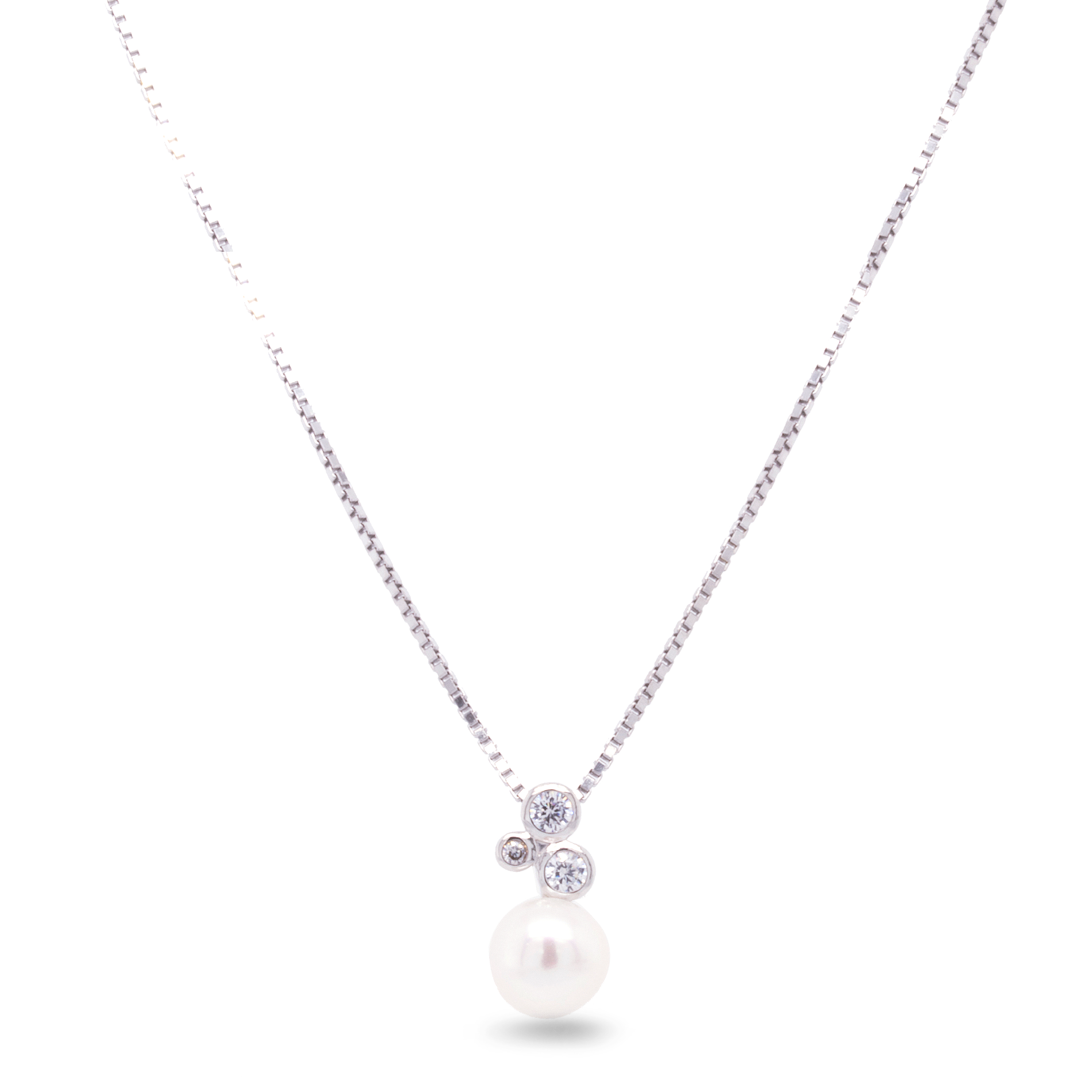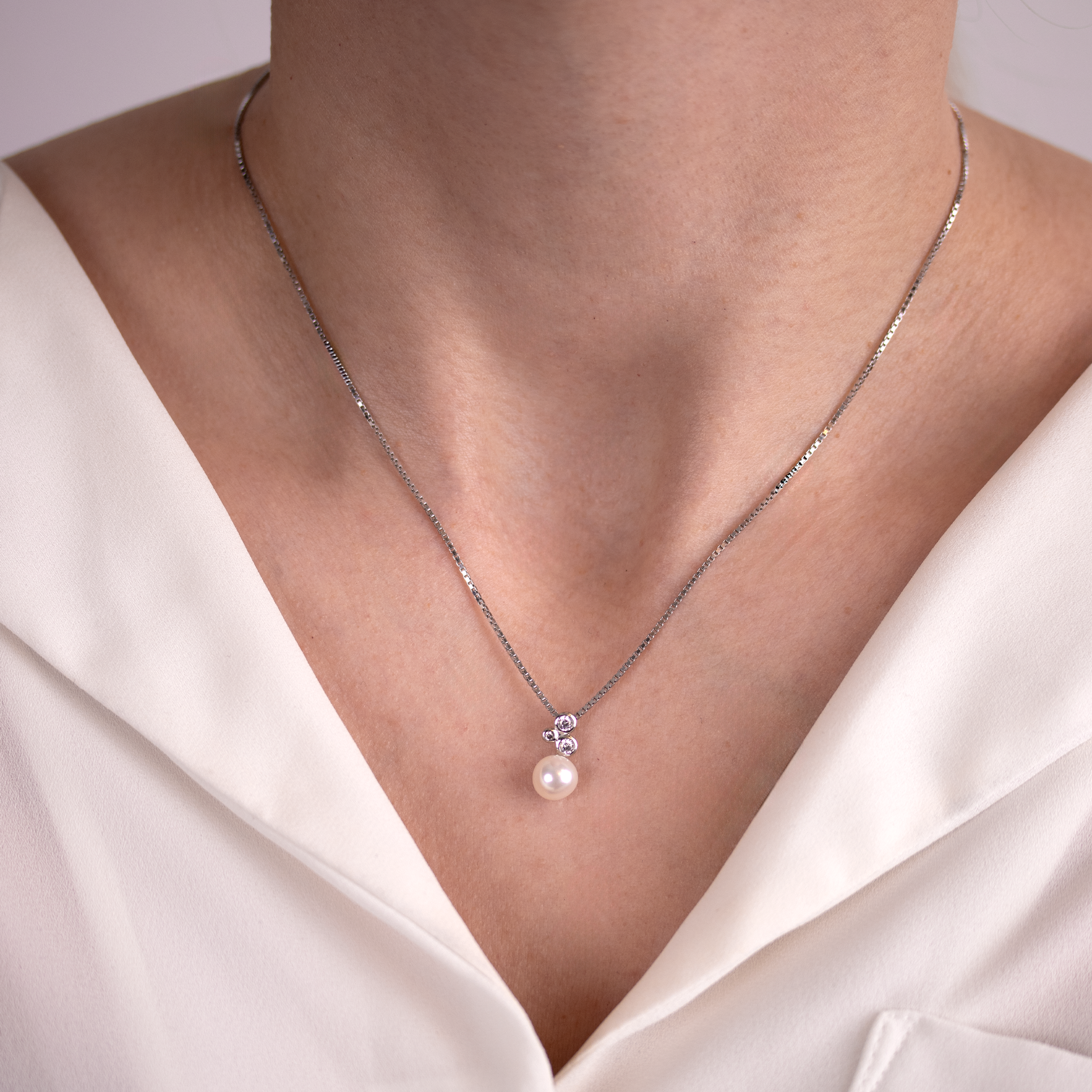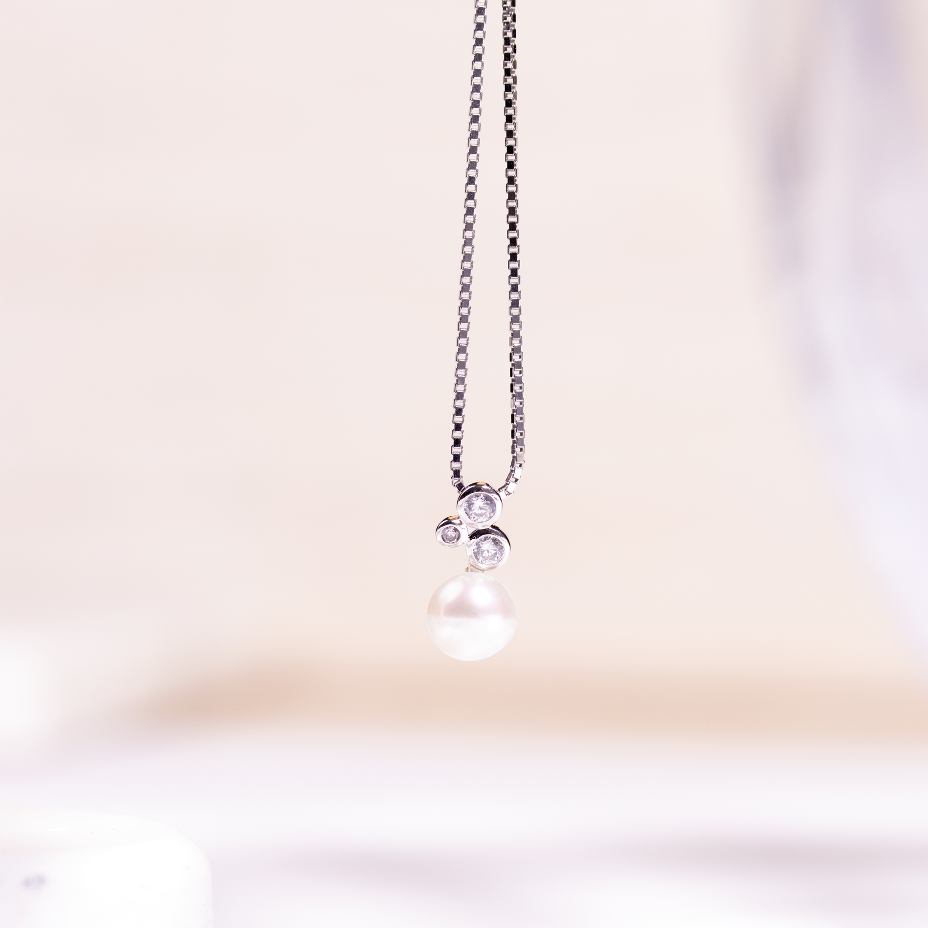 Lad vores Ella halskæde i sølv fortrylle dig med elegance og enkelhed. Det delikate perlevedhæng er kronet af tre klare zirkonia sten, der tilføjer en subtil glans. Et perfekt valg for dem, der søger et klassisk smykke med et moderne twist.