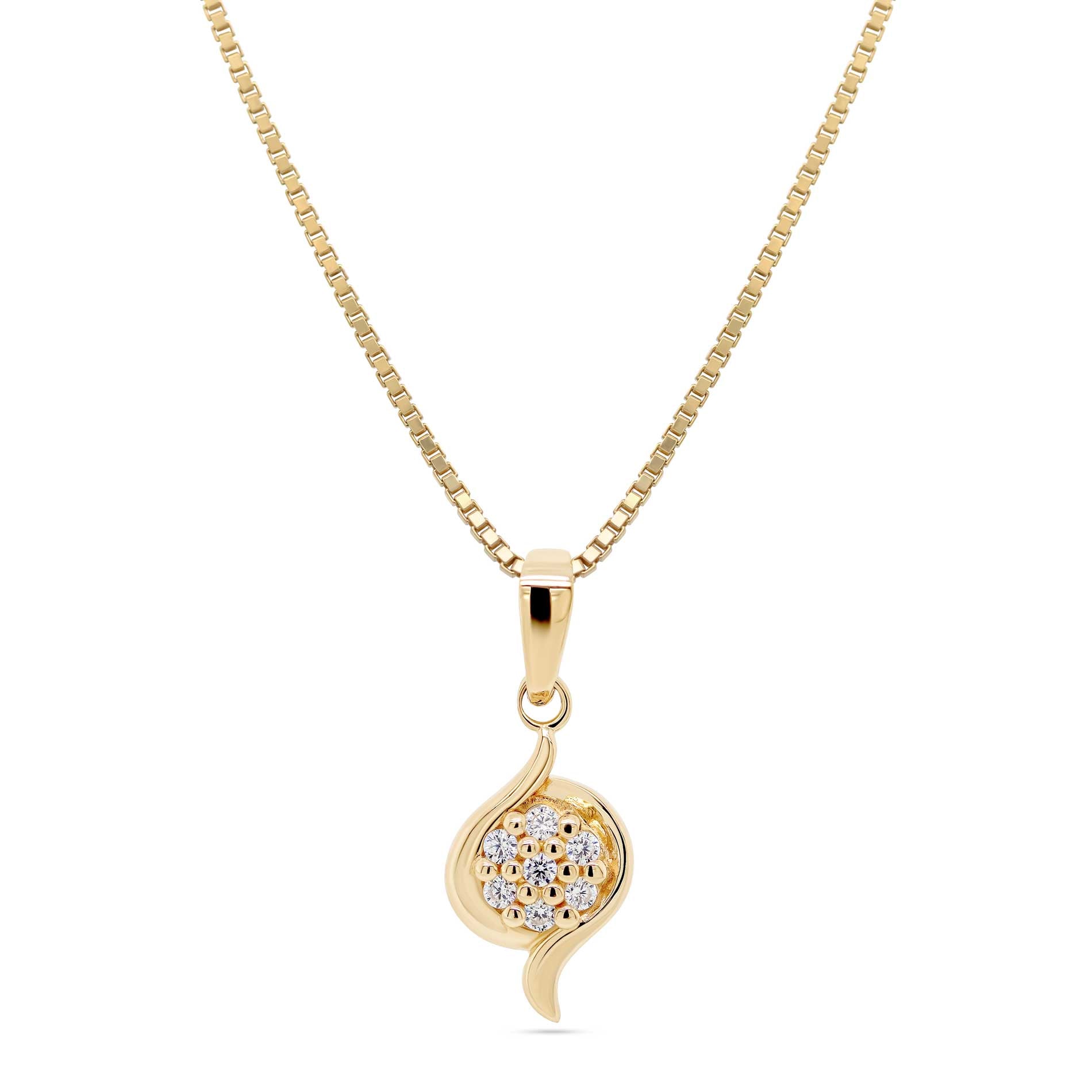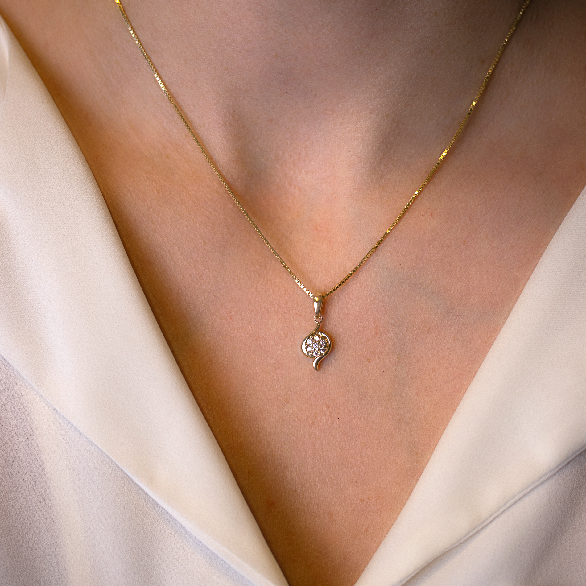 Imola vedhænget i 8 karat guld er en smuk og delikat smykke, hvor guldet elegant snoer sig omkring syv hvide zirkonia sten, der sammen danner en subtil blomsterform. Dette smykke udstråler både elegance og raffinement, og den bløde, diskrete design gør det ideelt til både hverdag og fest. Et ideelt valg for dem, der værdsætter tidløs skønhed og fine detaljer. Vedhænget leveres med en forgyldt sølvkæde.