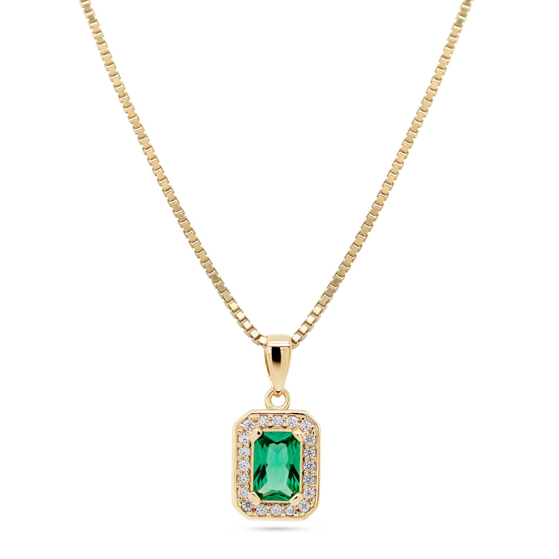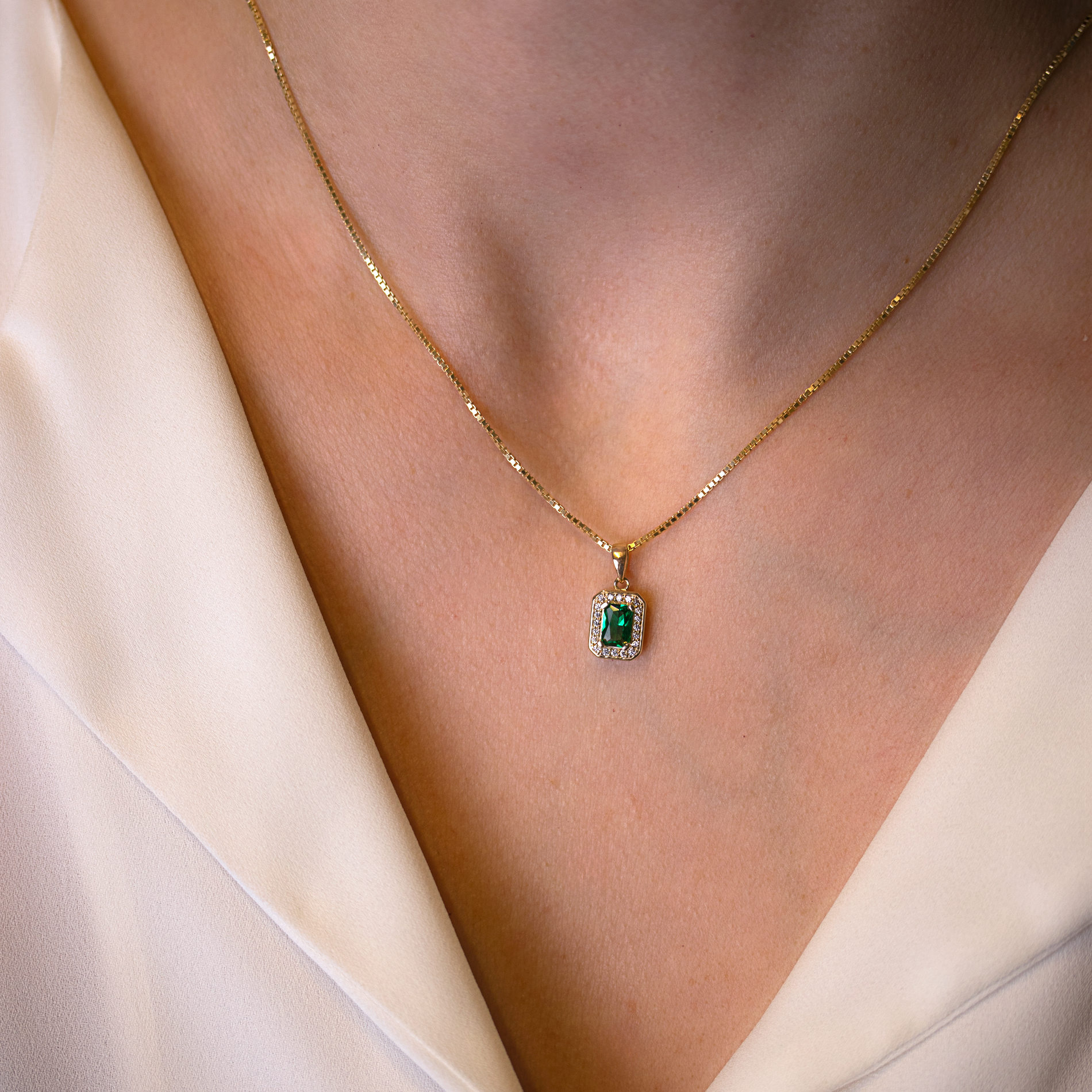 Lisabon vedhænget i 8 karat guld er et smykke med klassisk elegance og farverig charme. En strålende syntetisk smaragd danner smykkets centrum og er omkranset af funklende hvide zirkonia sten, som fremhæver dens skønhed. Vedhænget leveres med en forgyldt sølvkæde, der fuldender det sofistikerede look. Perfekt som en gave eller til at tilføje et strejf af luksus til dit eget smykkeskrin.