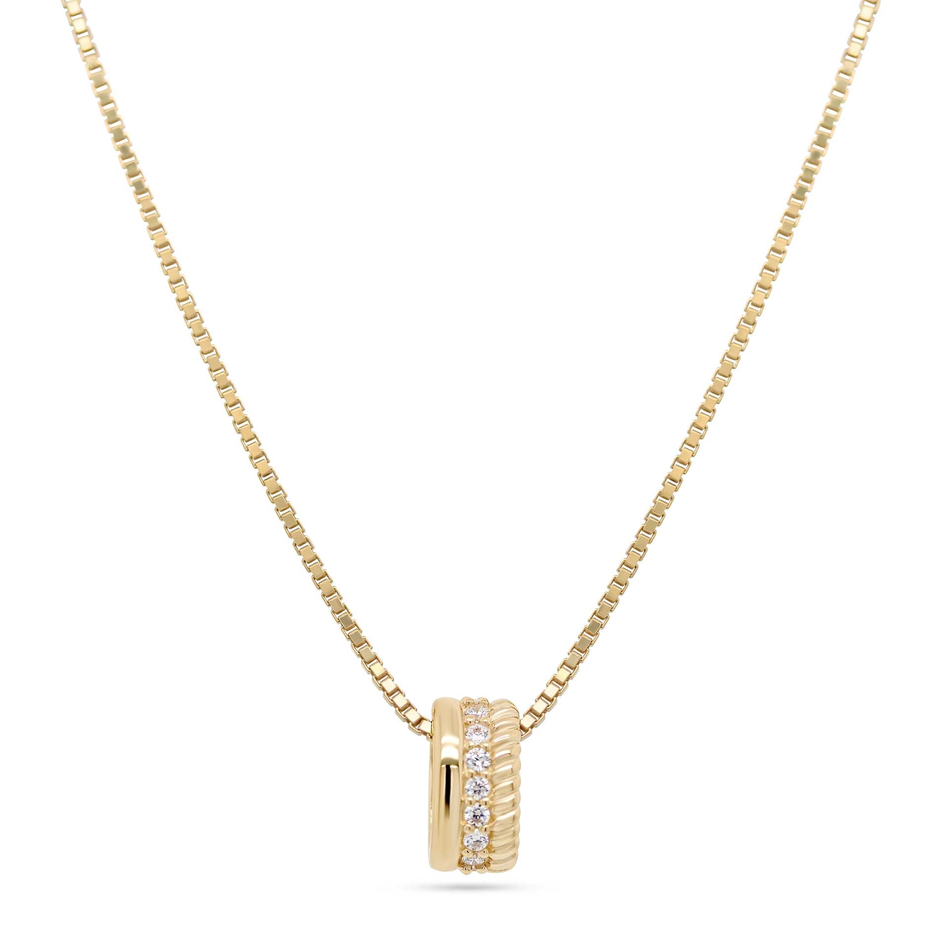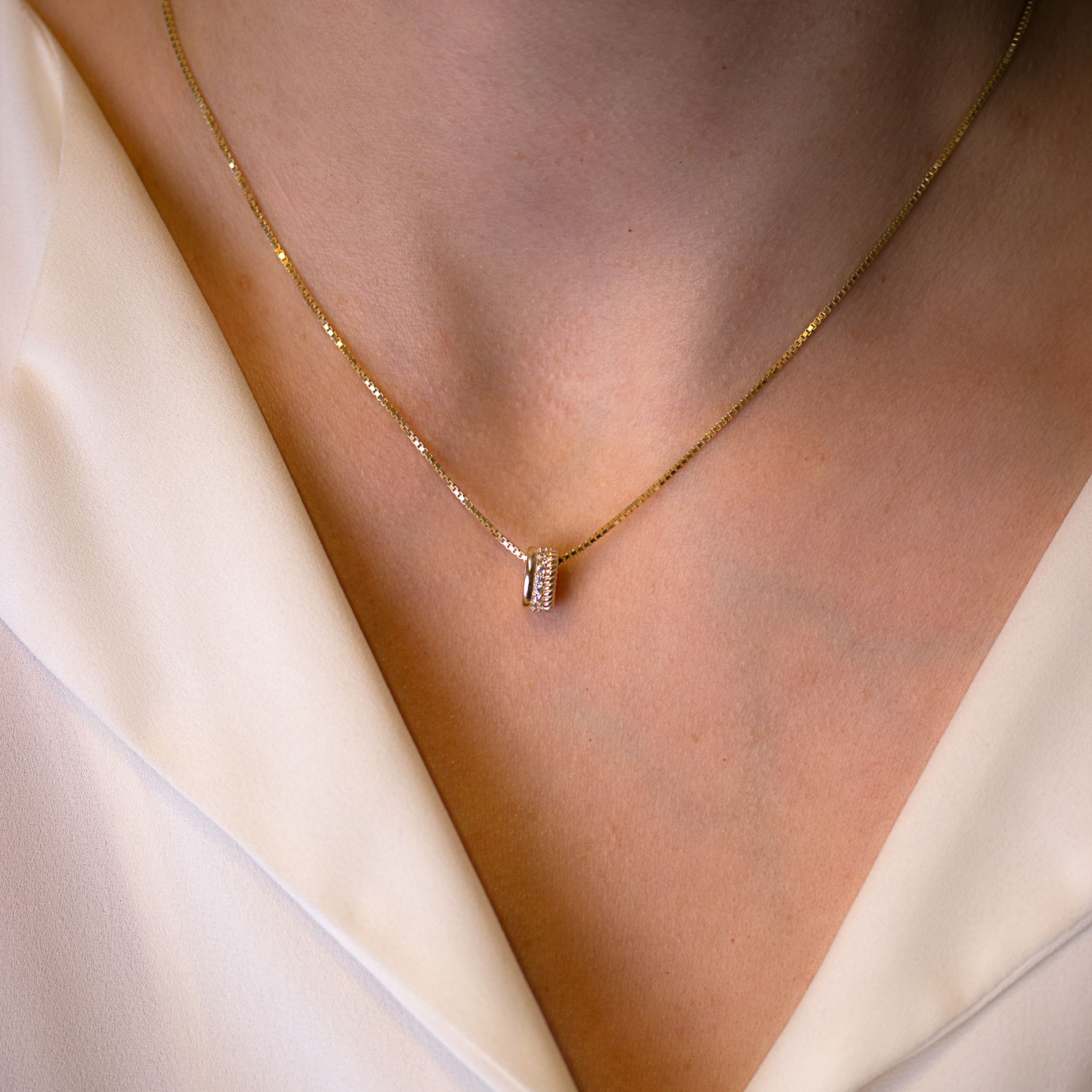 Pisa vedhæng i 8 karat guld er et unikt og stilfuldt smykke, der kombinerer tre forskellige ringe i ét design. Den ene ring er blank og poleret, den anden er besat med funklende zirkonia sten, og den tredje har en elegant bølget overflade. Tilsammen skaber de et smukt og dynamisk udtryk, der passer perfekt til både hverdag og fest.