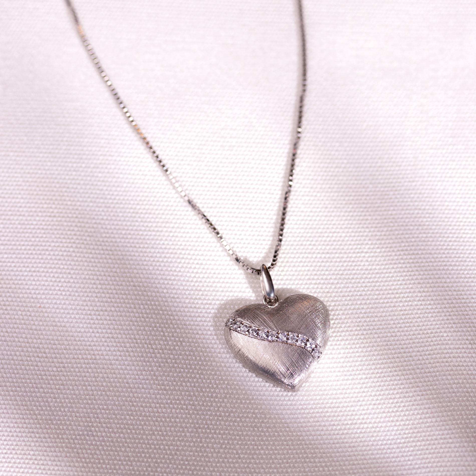 Skab et subtilt og elegant udtryk med vores Solveig halskæde. Det matte hjertevedhæng, indgraveret med et delikat bånd af glitrende zirkonia sten, tilføjer en fin touch til din stil. Lad denne halskæde være symbolet på din unikke elegance.