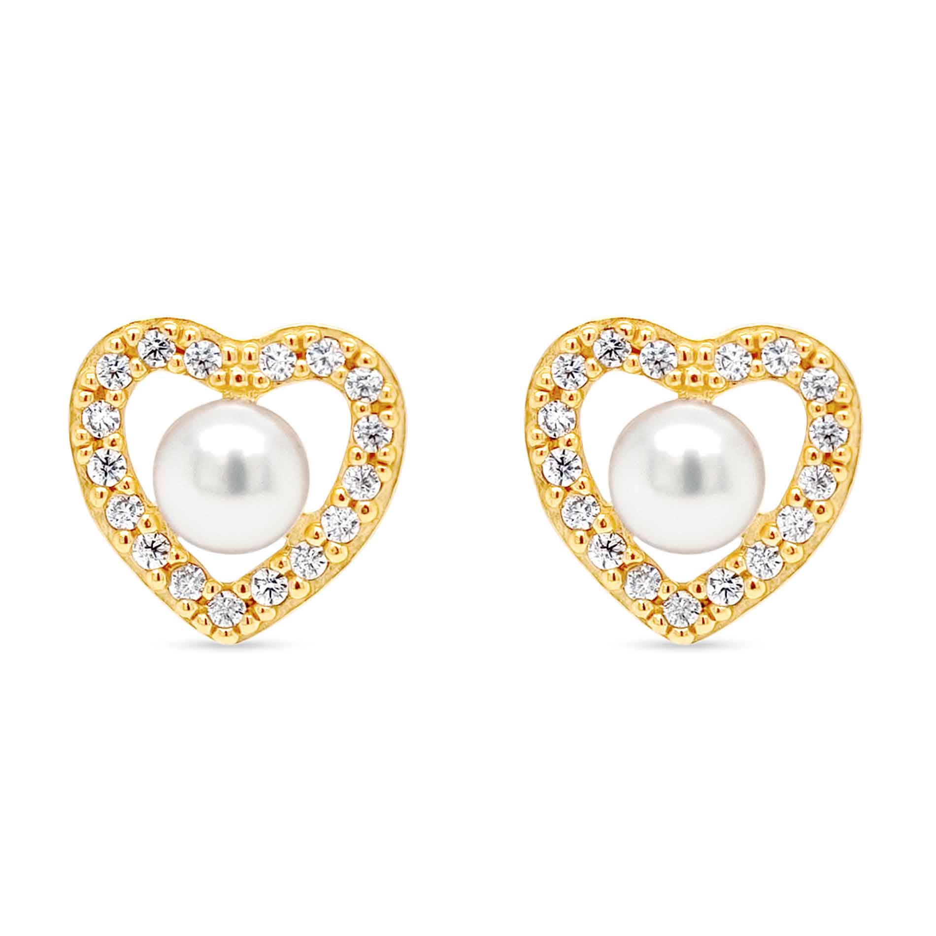 Chester øreringene i forgyldt sølv kombinerer romantik og elegance i et smukt design. En perle pryder midten, omgivet af et hjerte besat med funklende hvide zirkonia. Disse øreringe er perfekte til at tilføje et sofistikeret og kærligt touch til enhver stil, uanset om det er til en særlig lejlighed eller til at pifte hverdagen op.