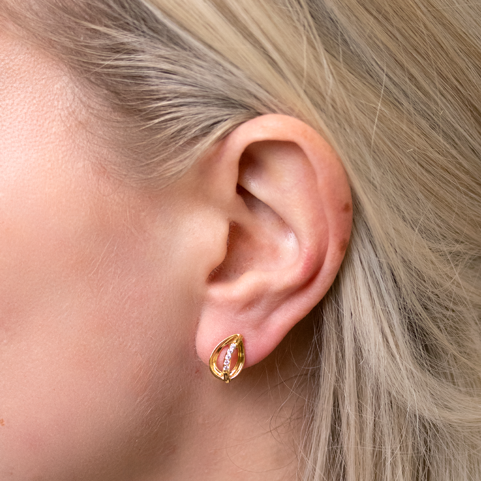 Lindo øreringene i forgyldt sølv er en perfekt kombination af naturlig skønhed og moderne elegance. Det unikke organiske design fremhæves af et bånd af funklende zirkonia sten, der tilføjer en luksuriøs glans. Disse øreringe er ideelle til både hverdag og særlige anledninger og vil uden tvivl tiltrække opmærksomhed med deres sofistikerede udtryk.