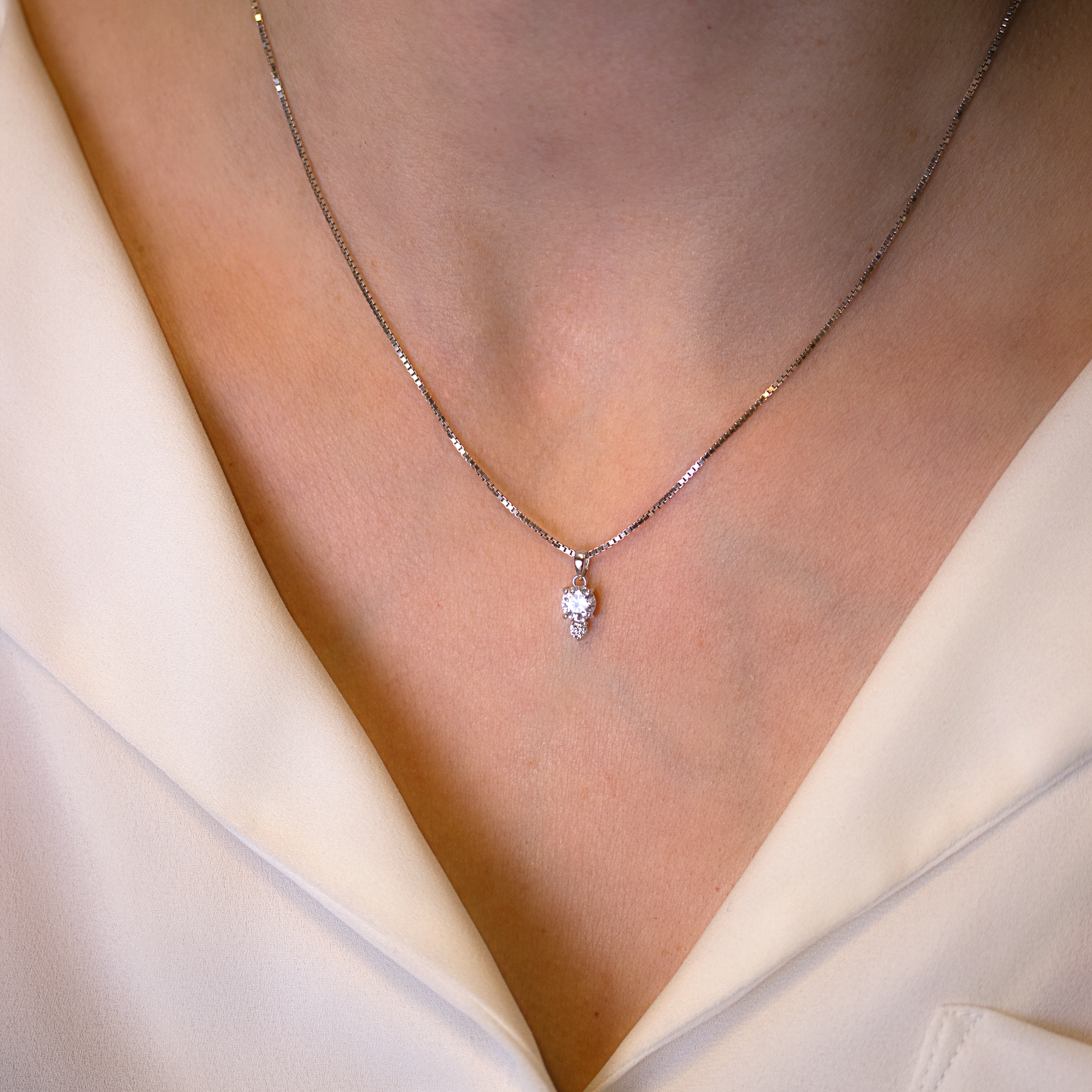 Vores Dobbelt solitaire vedhæng i sterling sølv er et strålende udtryk for enkel elegance. De to hvide/klare zirkonia sten fanger lyset på smukkeste vis, hvilket gør dette vedhæng til den perfekte ledsager til enhver lejlighed. Et subtilt og alligevel iøjnefaldende smykke, der tilføjer et strejf af glans til enhver samling.