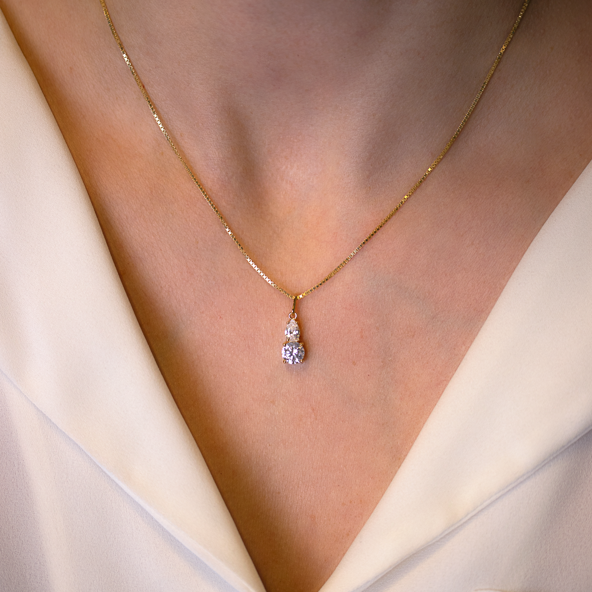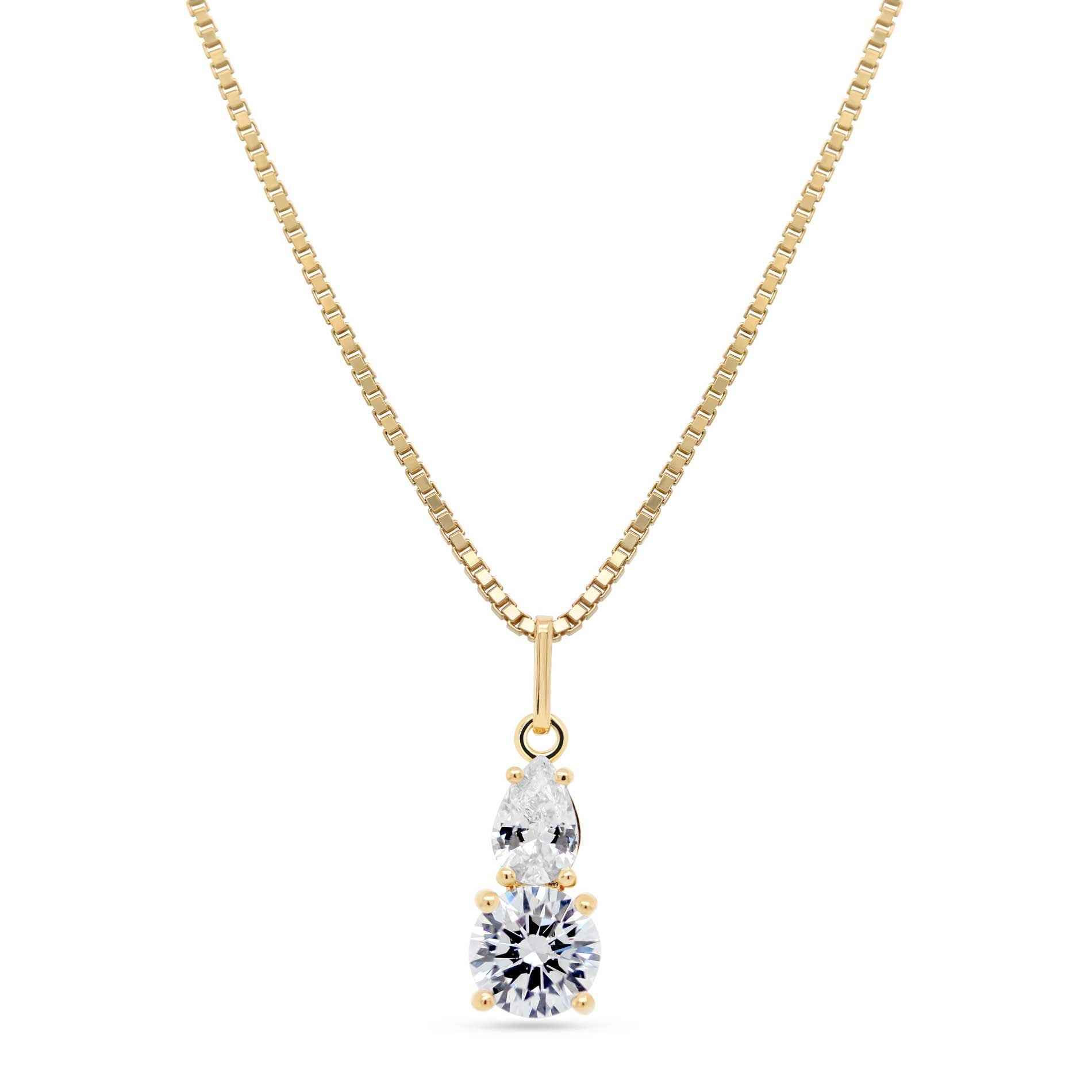 Harper halskæden i forgyldt sølv er en udsøgt kombination af elegance og enkelhed. Vedhænget består af en dråbeformet zirkonia, der elegant falder ned til en rund zirkonia, hvilket skaber et harmonisk og strålende design. Perfekt som et sofistikeret smykke til både hverdag og festlige lejligheder.