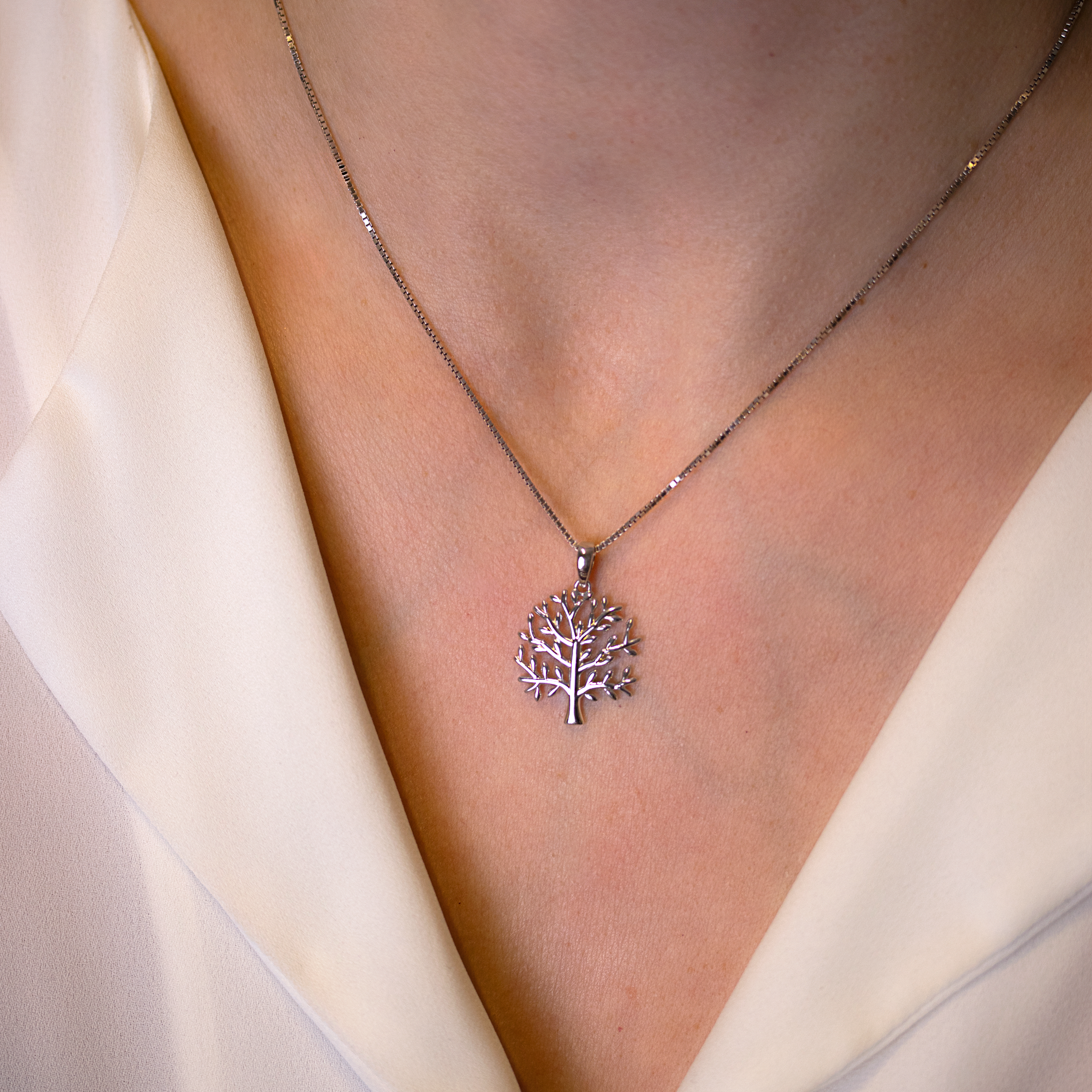 Dyk ned i symbolikken af Livets Træ med vores fortryllende halskæde i sterling sølv. Fine og delikate blade tilføjer en delikat og romantisk touch til dette tidløse smykke. Bær det som et udtryk for vækst, kærlighed og skønheden i livet.