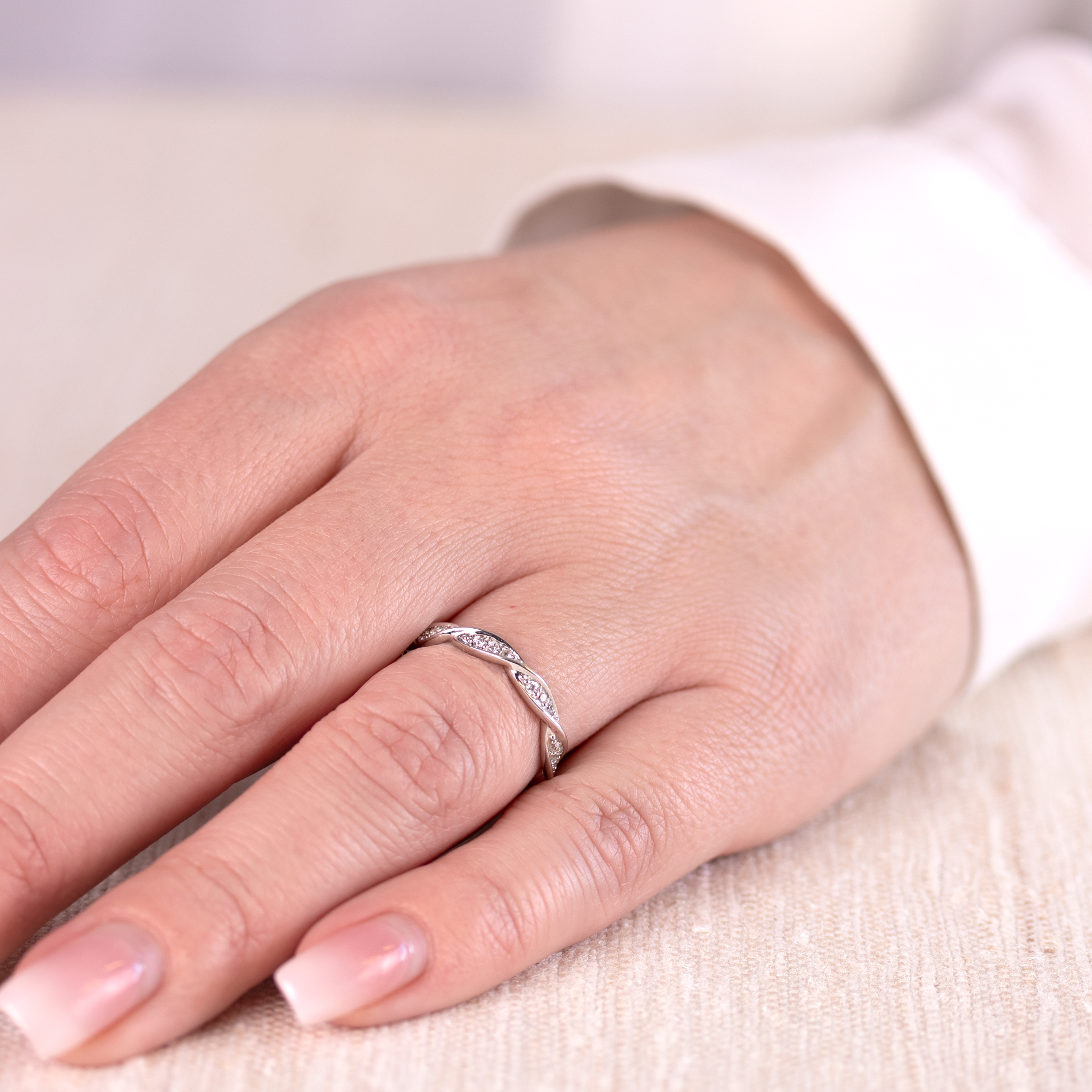 Bring en subtil elegance til dit daglige look med denne smukke snoede alliancering i sterling sølv. Det snoede design tilføjer en unik og stilfuld dimension til ringen, der skiller sig ud fra traditionelle allianceringe. Den blanke sølvkonstruktion giver en glans, der komplimenterer enhver og gør denne ring til et perfekt valg som et symbolsk udtryk for kærlighed og forpligtelse.