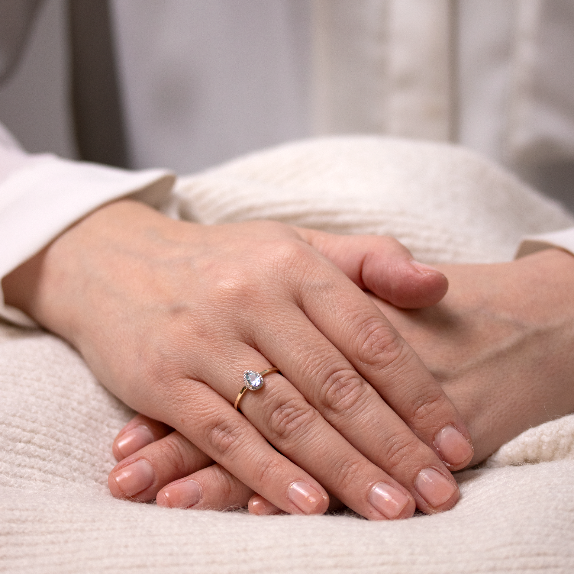 Vienna ringen i 8 karat guld bringer en sofistikeret elegance til enhver smykkesamling. Den smukke dråbeformede blå topas udstråler en fortryllende dybde, mens den er omkranset af strålende hvide zirkonia sten, der fremhæver dens glans. En perfekt kombination af farve og klassisk design, der gør denne ring ideel til både hverdagsbrug og særlige lejligheder.