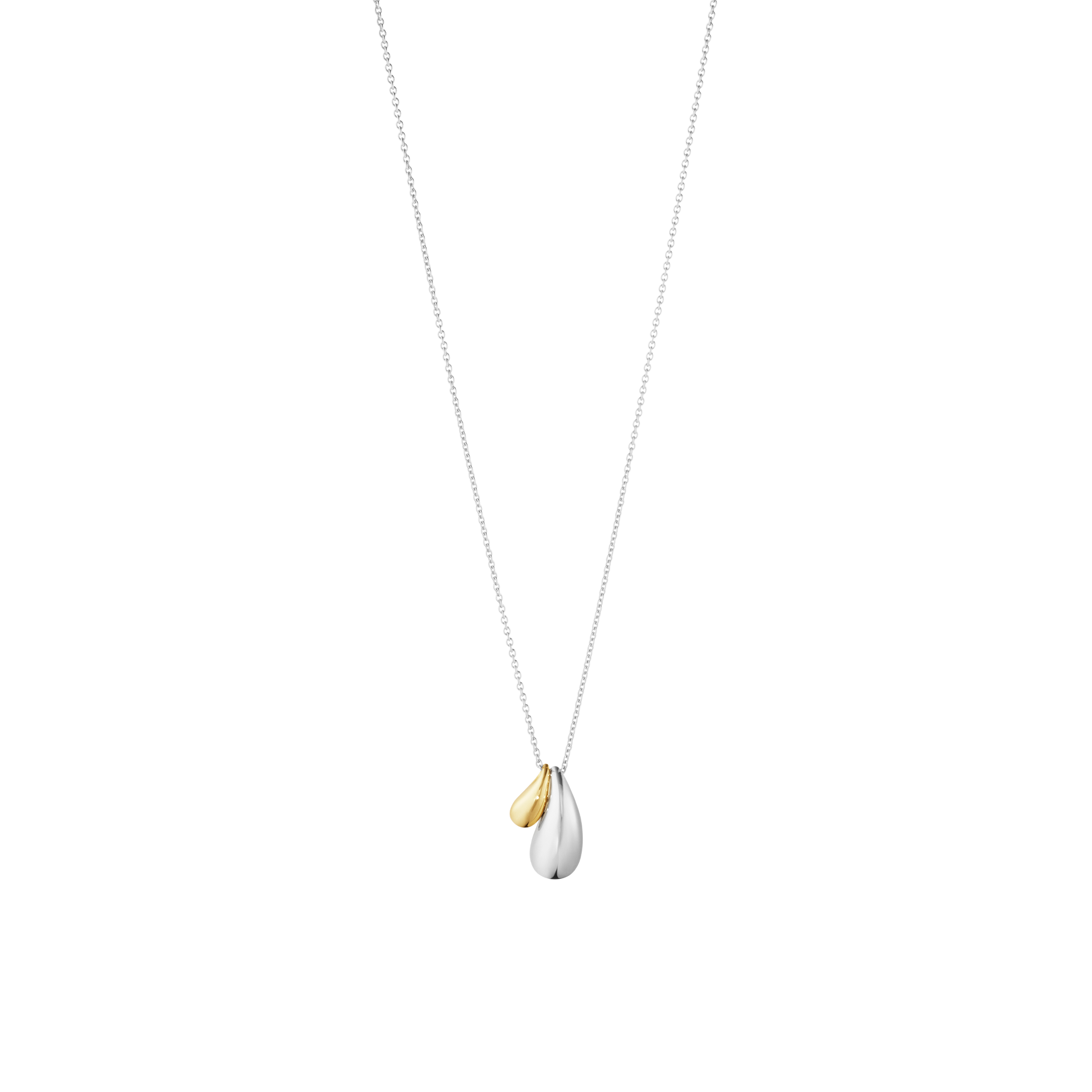 Georg Jensen Reflect dobbeltvedhæng halskæde er et elegant og moderne smykke, designet af Jacqueline Rabun. Kæden prydes af to dråbeformede vedhæng — ét i sterling sølv og ét i 18 kt guld — som sammen skaber et flydende, organisk udtryk. De bløde former giver et skulpturelt look, mens materialekombinationen tilfører varme og kontrast. Denne halskæde er alsidig og kan styles både til hverdagsbrug og ved festlige lejligheder, og den udstråler samtidig tidløs elegance og personligitet.