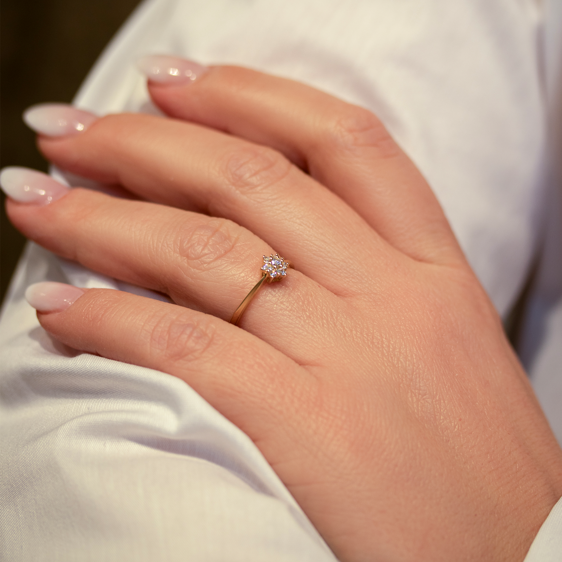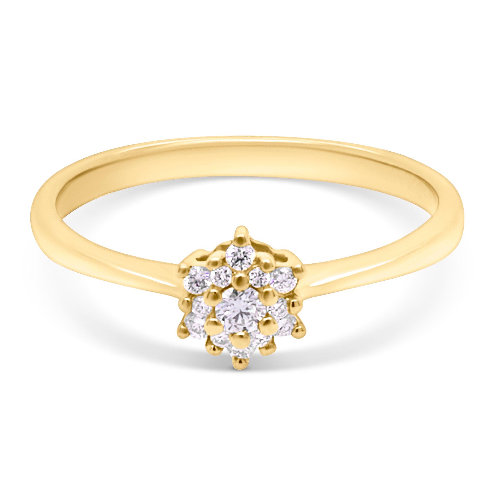 Stardust ring er en fin og elegant ring i 18 kt. guld, udsmykket med brillantslebne diamanter på i alt 0,10 ct. Diamanterne er samlet i en stjerneformet klynge, der giver ringen et let og strålende udtryk. Den centrale diamant fremhæves af de omkringliggende sten og skaber en smuk glans, når lyset rammer overfladen.
