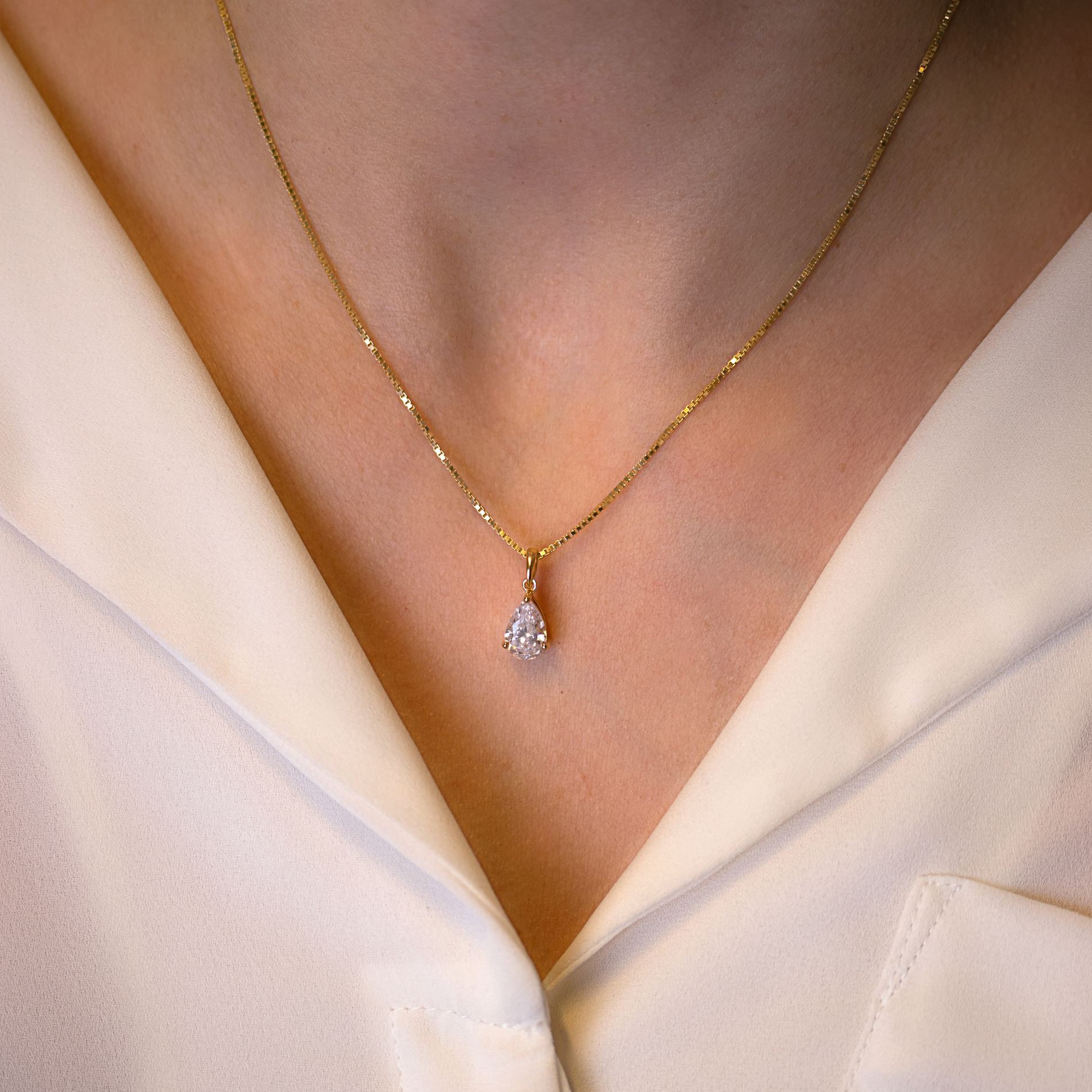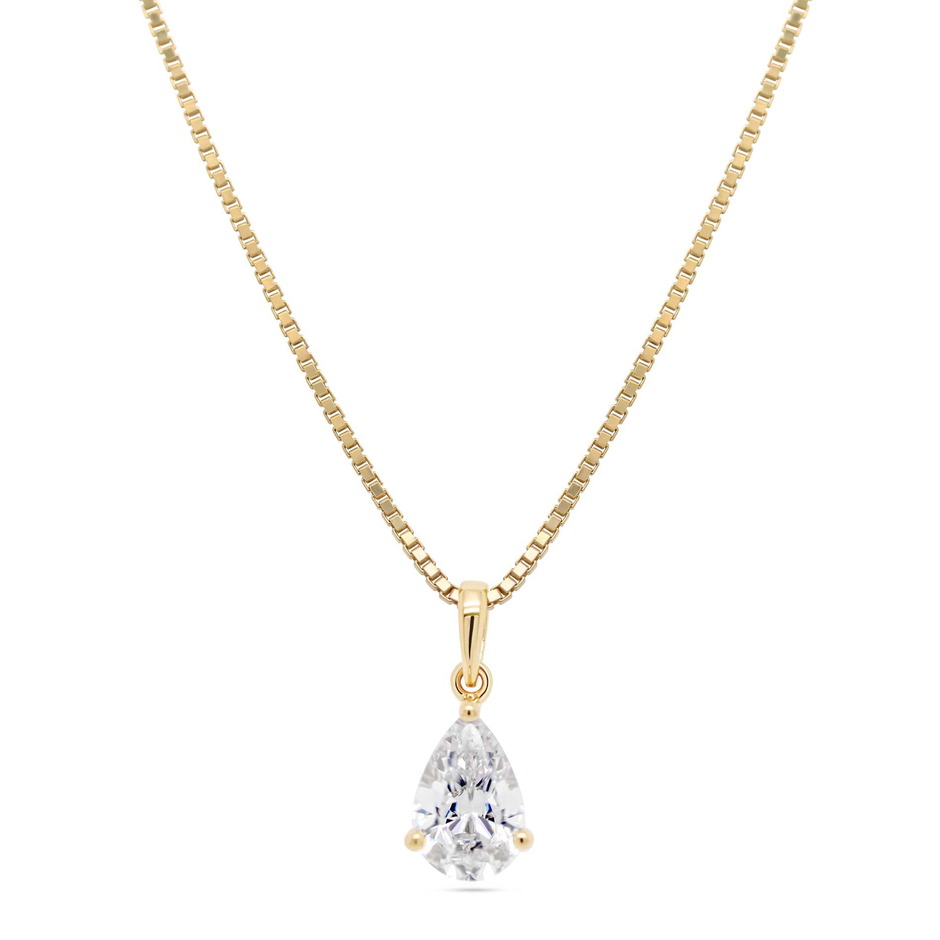 Denne elegante drop halskæde i forgyldt sølv er det perfekte smykke til at tilføje et strejf af raffineret skønhed til din stil. Den dråbeformede hvide zirkonia sten udstråler elegance og fanger lyset på smukkeste vis, hvilket gør vedhænget ideelt til både hverdag og særlige anledninger. Kombiner det med din yndlingskæde for et personligt og sofistikeret look.