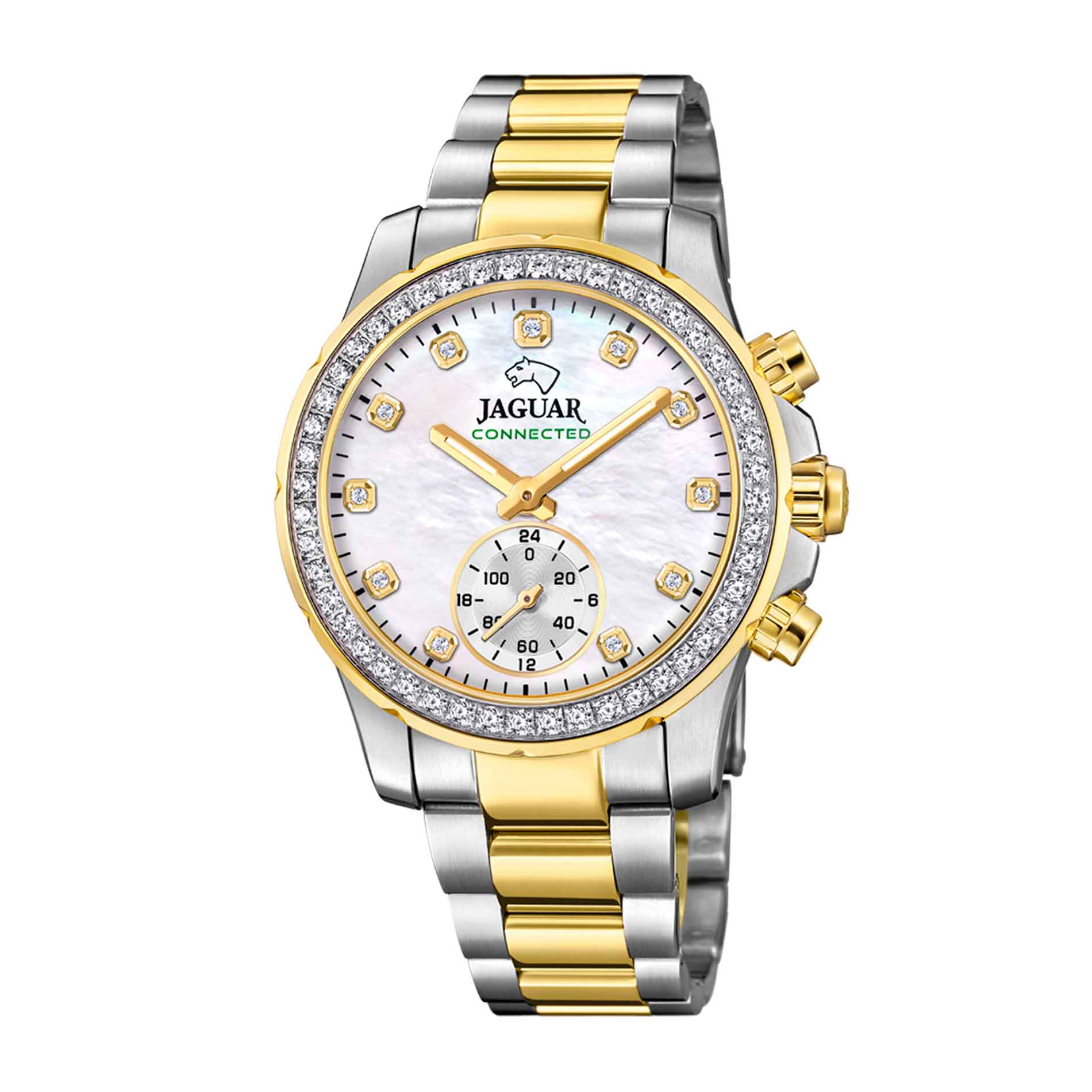 Jaguar Connected er et elegant dameur, der kombinerer stil og funktion. Dette kvartsur har en stilfuld sølv urkasse og en hvid urskive, der måler 37 mm i diameter. Remmen er en flot to-tone kombination af guld og sølv og er dekoreret med smukke zirkoner. Uret er udstyret med praktiske chronograph-funktioner og er vandtæt ned til 50 meter. Med 2 års garanti tilbyder Jaguar Connected det bedste inden for schweizisk urhåndværk og moderne design.