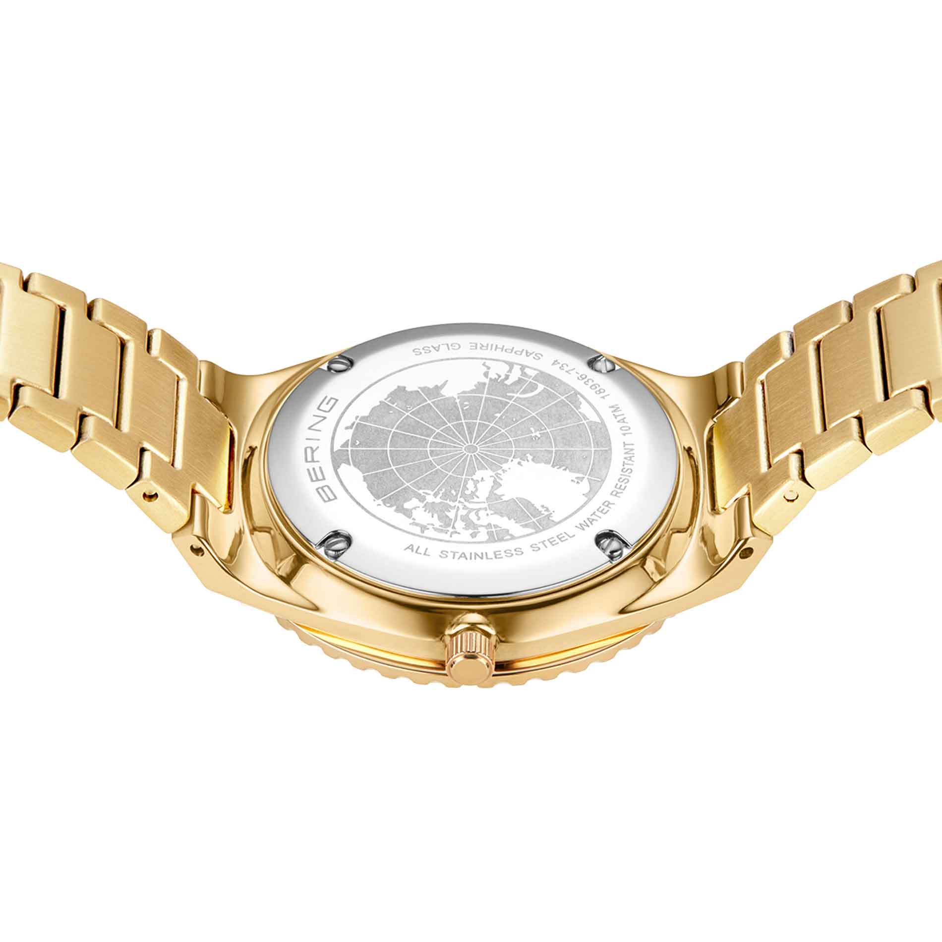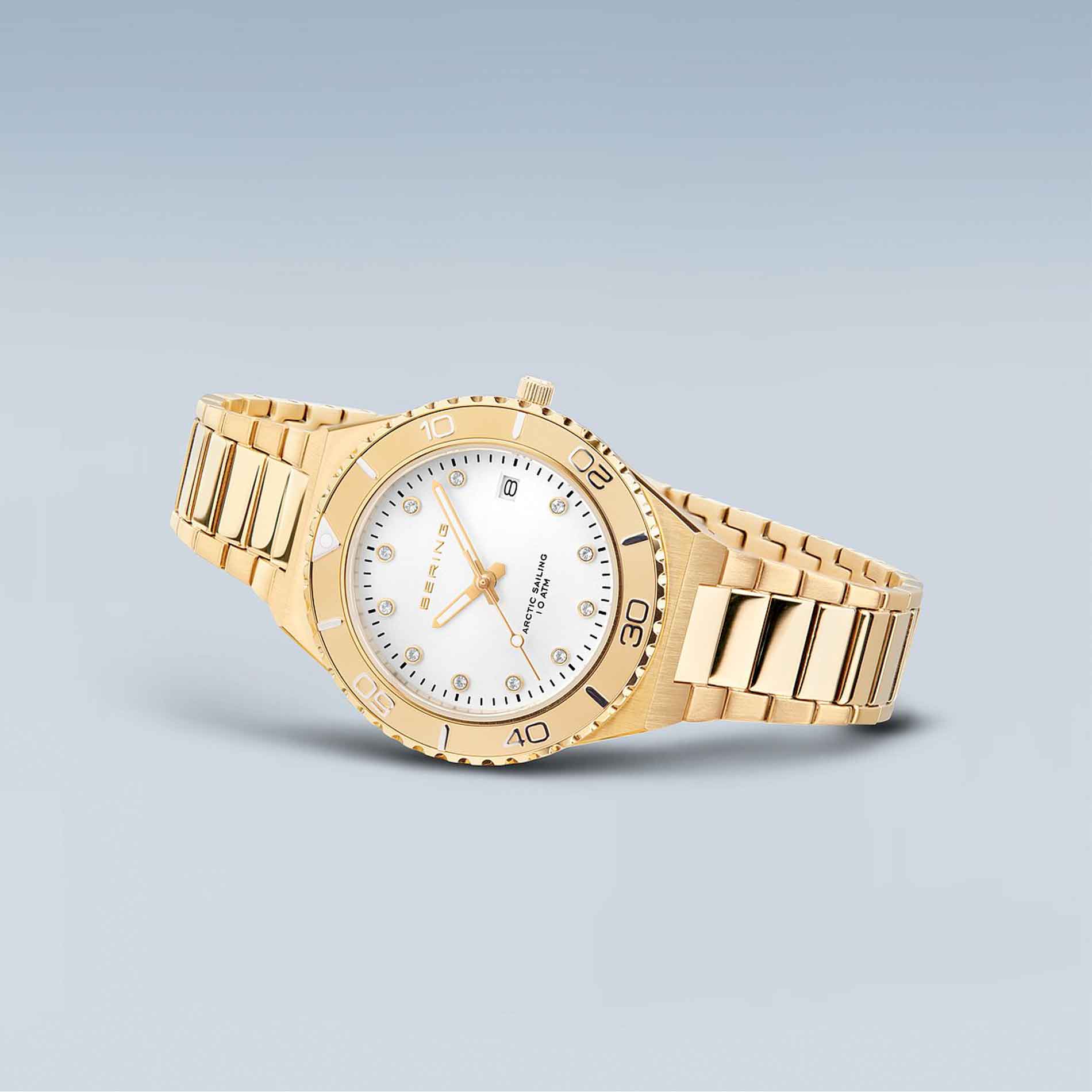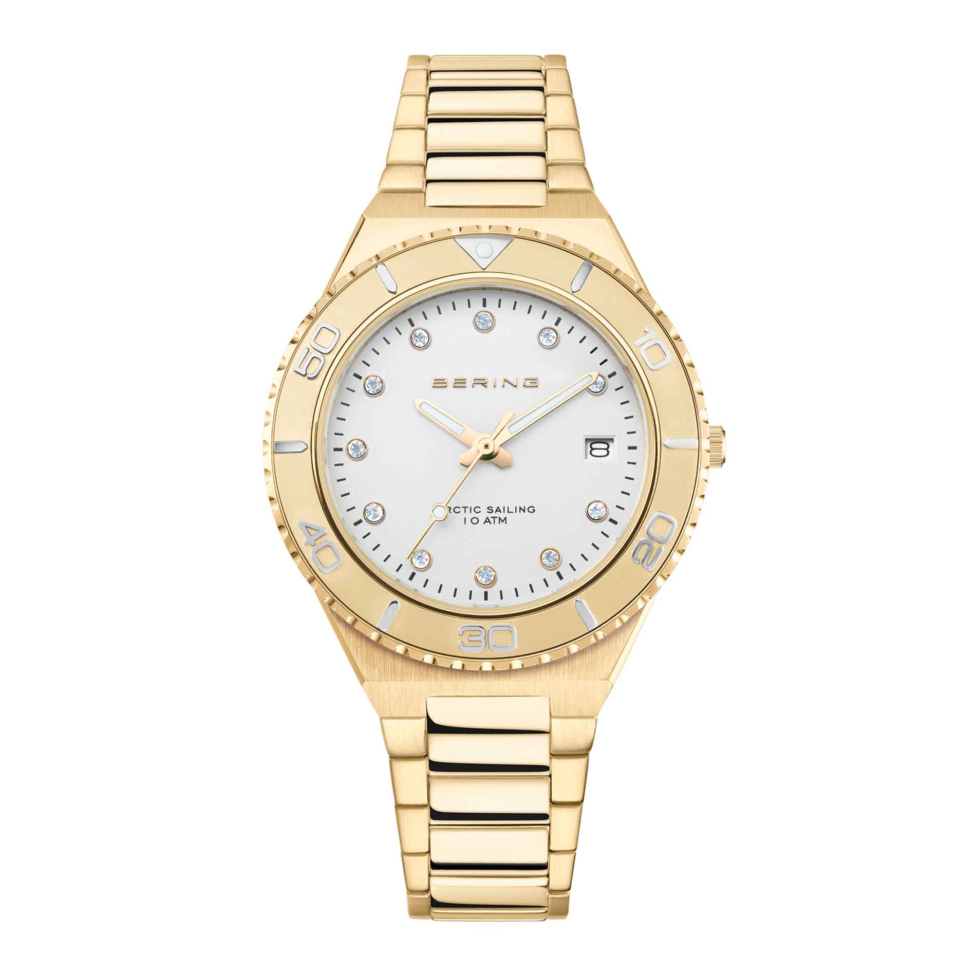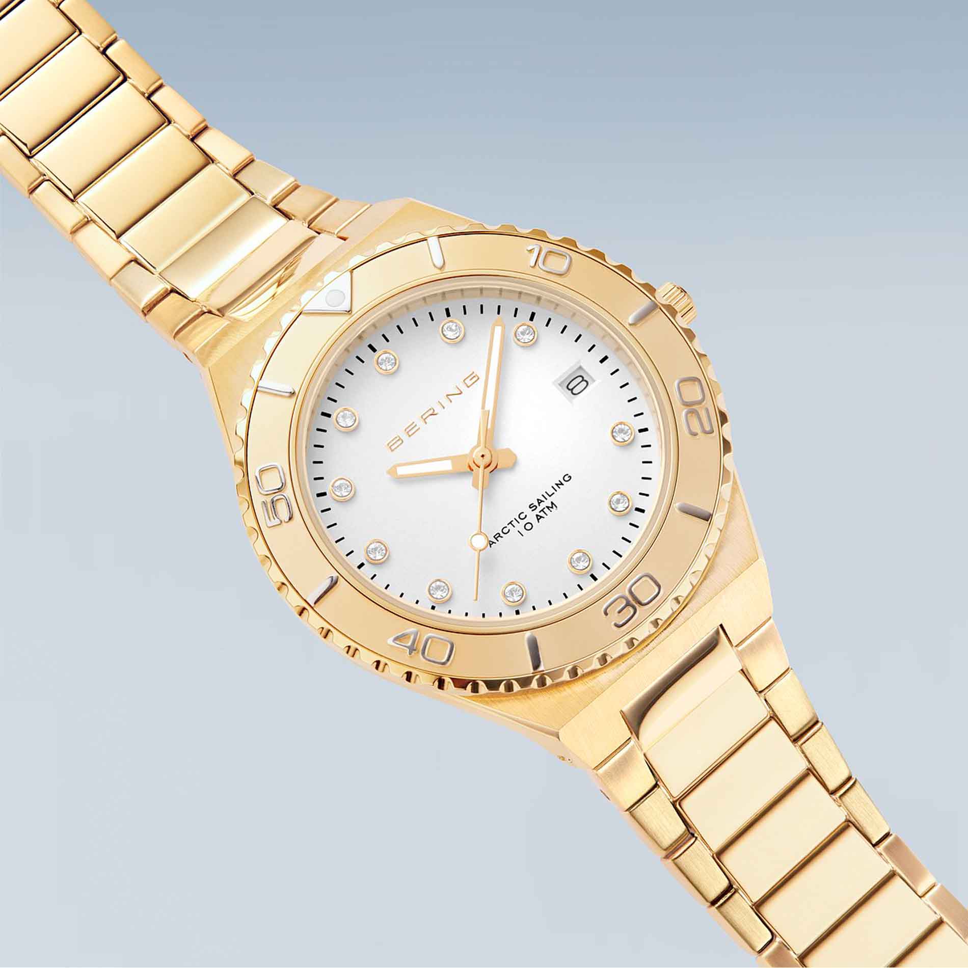 Bering Classic Arctic Sailing uret er det perfekte valg til dem, der søger stil og funktionalitet. Med sin polerede og børstede guldurkasse af rustfrit stål og en diameter på 36 mm, udstråler dette ur en subtil elegance. Safirglasset sikrer en klar og ridsebestandig skærm, der kan modstå de mest udfordrende forhold. Den rustfri stållænke i guldfarve med foldespænde kombinerer holdbarhed med luksus, og den hvide urskive tilføjer et friskt og sofistikeret præg. Med en vandtæthed på 10 ATM er dette ur perfekt til både hverdag og eventyr.