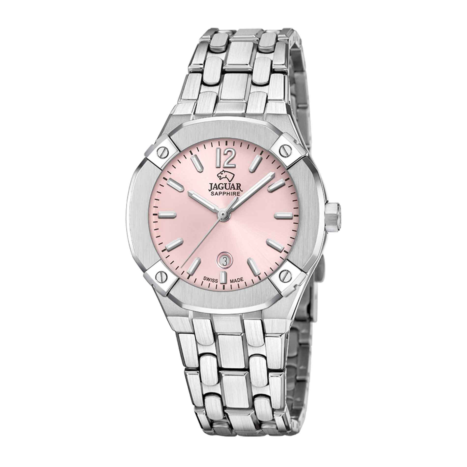 Jaguar Lady Diplomatic J1016/2 er et elegant dameur med en sofistikeret pink urskive og sølvindekser, der giver en feminin og luksuriøs følelse. Uret er beskyttet af ridsefast safirglas med en anti-refleksbehandling, der sikrer krystalklar læsbarhed under alle lysforhold. Med et schweizisk fremstillet HARLEY 785 kvartsurværk, kendt for sin præcision og pålidelighed, giver dette ur præcis time-, minut- og sekundangivelse. Dette ur er både stilfuldt og praktisk, designet til at modstå tidens tand og bevare sin skønhed.