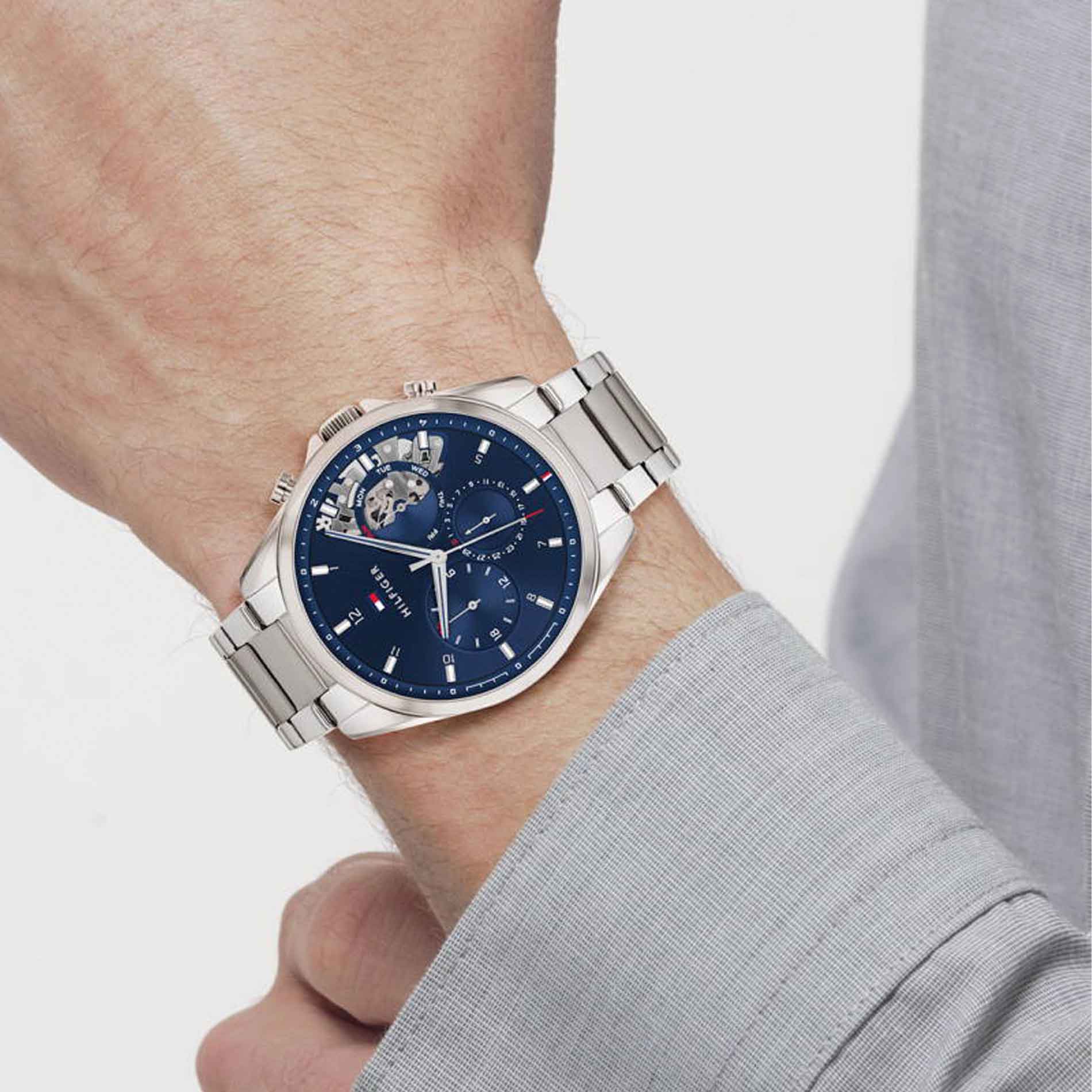 Tommy Hilfiger Baker er et stilfuldt herreur, der kombinerer klassisk design med moderne funktionalitet. Med en diameter på 43 mm har dette ur en imponerende tilstedeværelse på håndleddet. Den blå skive harmonerer smukt med den sølvfarvede urkasse i rustfrit stål og giver et elegant udtryk. Uret er udstyret med en holdbar stållænke og mineralglas, der sikrer langvarig brug og beskyttelse mod ridser. Med en vandtæthed på 5 ATM (50 meter) kan dette ur tages med på svømmeture og andre vandaktiviteter uden bekymring.