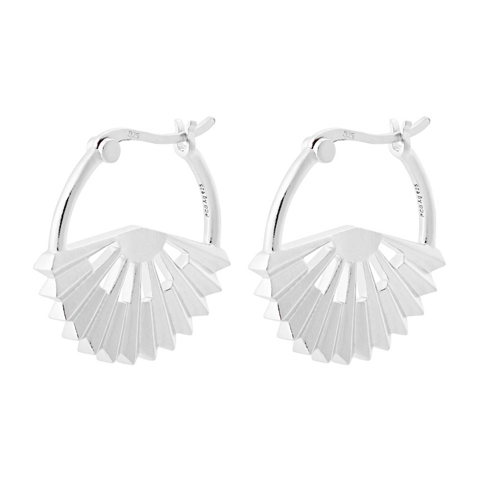 Pernille Corydon Sphere Øreringe - Små Kunstværker i 23 mm. De betagende Sphere Øreringe i 23 mm størrelse er en hyldest til de magiske øjeblikke, hvor vintersolen bryder igennem den kolde dis og skaber en sfære af blødt lys. Øreringene har en smuk vifteform, der indfanger denne dans mellem kulde og varme, og de symboliserer øjeblikket, hvor solen fremstår utydelig mod den vinterblå himmel.