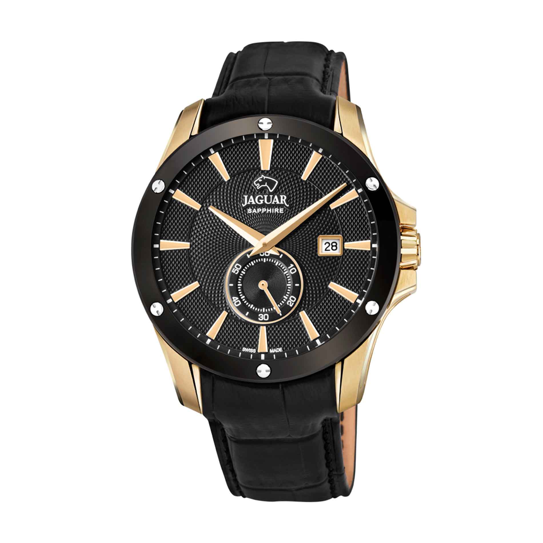 Jaguar Acamar - Elegant Herreur i Guld og Sort Læder. Dette herreur fra Jaguar kombinerer luksus med funktion i et smukt design. Urkassen og urkransen er udført i elegant guld, der kontrasterer smukt med den dybe sorte urskive og rem i ægte læder. Med en diameter på 44 mm er dette ur imponerende og velegnet til de fleste lejligheder. Det er vandtæt op til 10 ATM (100 meter) og har safirglas for ekstra holdbarhed. Uret har praktiske funktioner som kronografer, datovisning og skruekrone. Jaguar Acamar er det ideelle valg for den moderne mand, der værdsætter både stil og ydeevne.