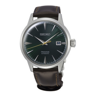 Seiko herreur - et automatisk ur af høj kvalitet med stil og præcision. Den sølvfarvede urkasse, grønne urskive og brun læderrem skaber et sofistikeret udtryk. Uret har automatisk urværk og praktisk datovisning. Med 5 ATM vandafvisning, hardlex crystal mineralglas og transparent bagkasse, er dette ur både funktionelt og elegant.
