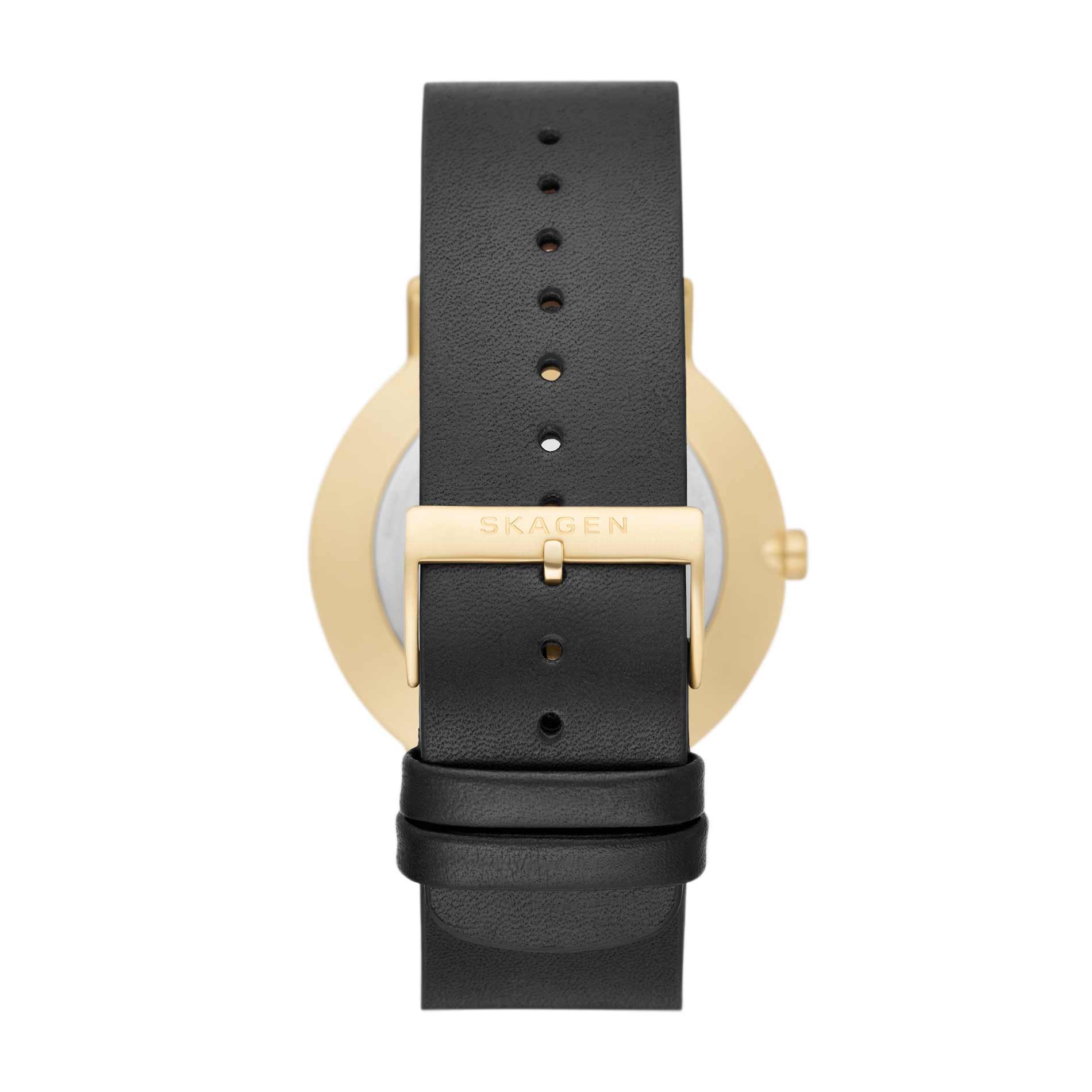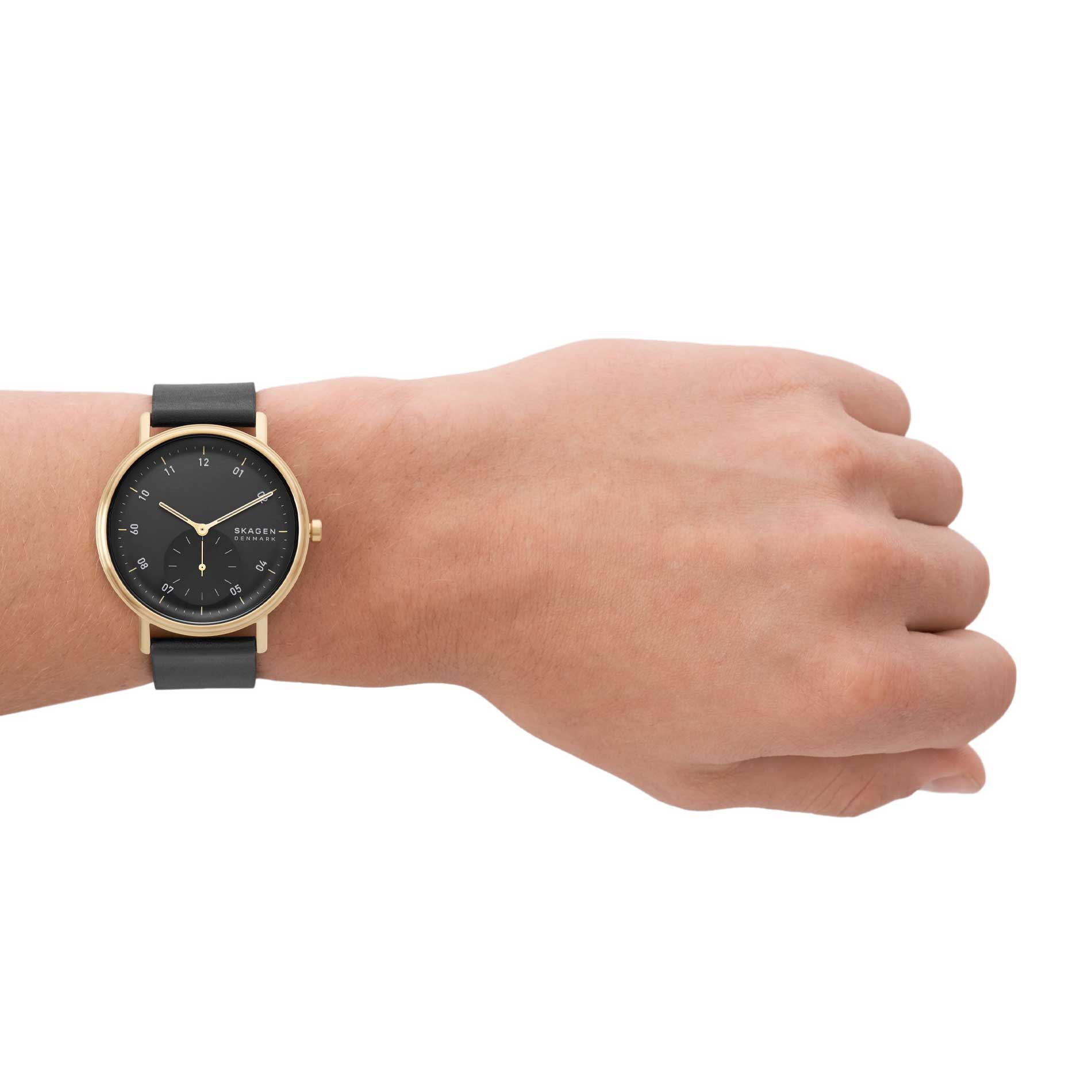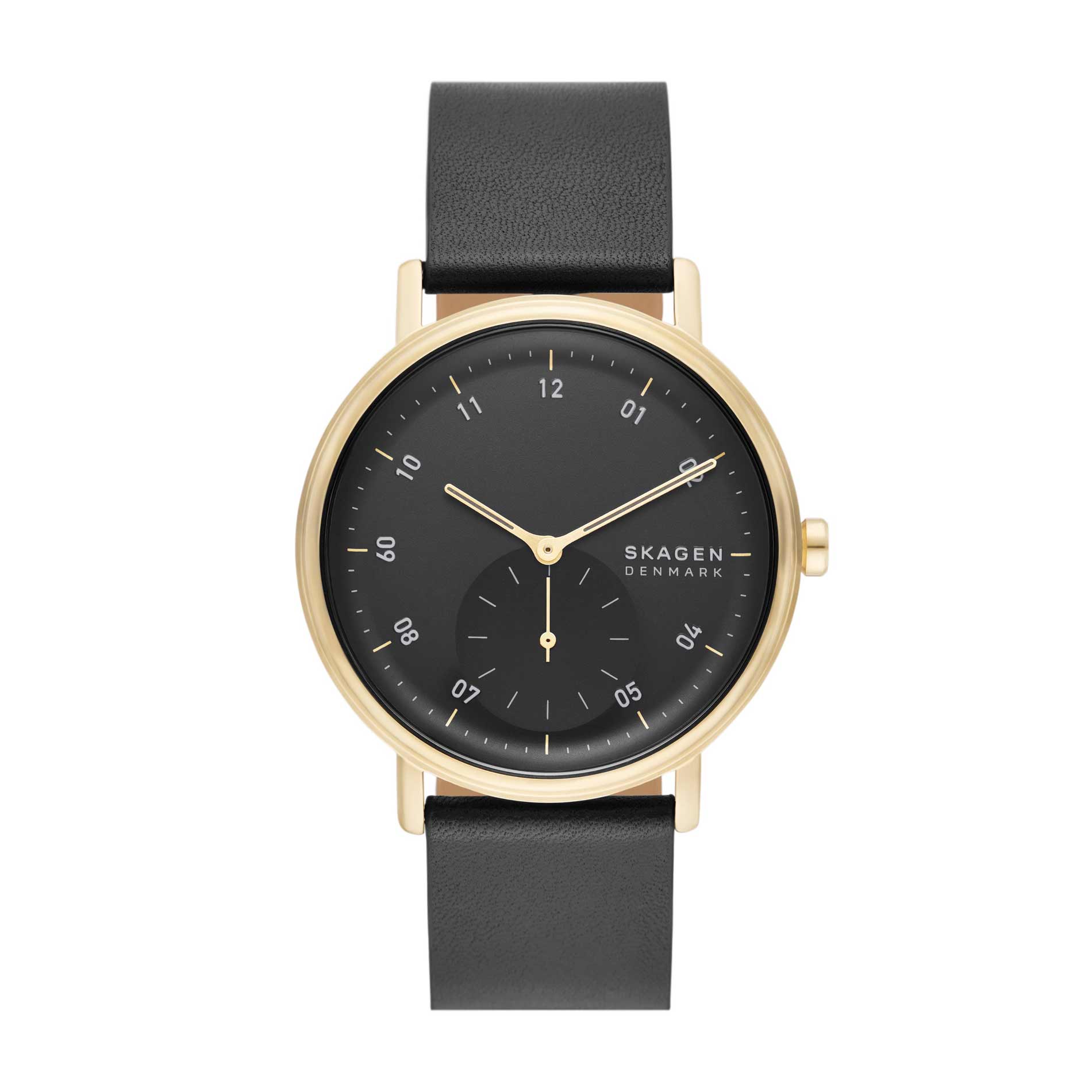 Skagen Kuppel Lille er det perfekte blend af elegance og funktionalitet. Dette smukke ur har en sort urskive med selvlysende visere, som giver fremragende synlighed i alle lysforhold. Uret har en diameter på 44 mm og er indrammet af en gylden stålkasse med en sort læderrem. Uret er drevet af et præcist kvartsurværk, der sikrer nøjagtig tidsvisning. Det er også vandafvisende med en 3 ATM-vandafvisning og har separat sekundviser.