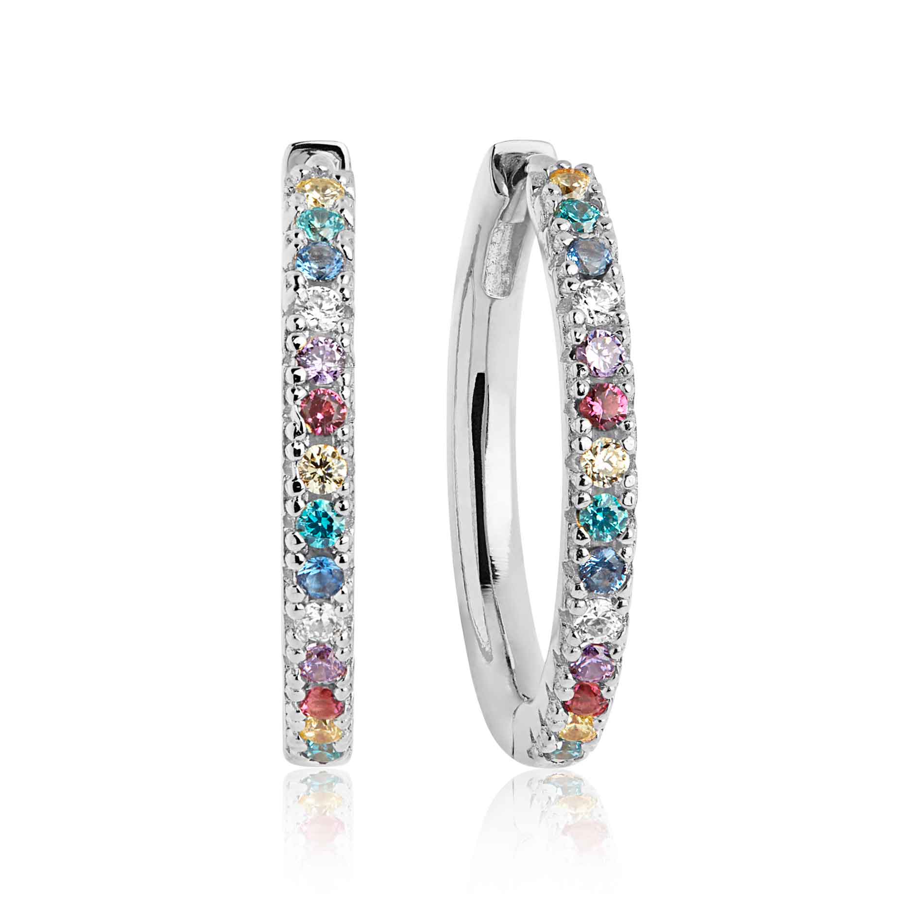 Disse øreringe i 925 sterlingsølv udstråler en strålende skønhed og elegance. Med deres blankpolerede overflade og glitrende facetslebne farvede zirkoniaer, er disse øreringe det perfekte accessory til enhver lejlighed. De har en imponerende diameter på 18 mm, der tilføjer et strejf af luksus til dit look. Disse øreringe er en tidløs klassiker, der vil forblive en favorit i din smykkesamling.