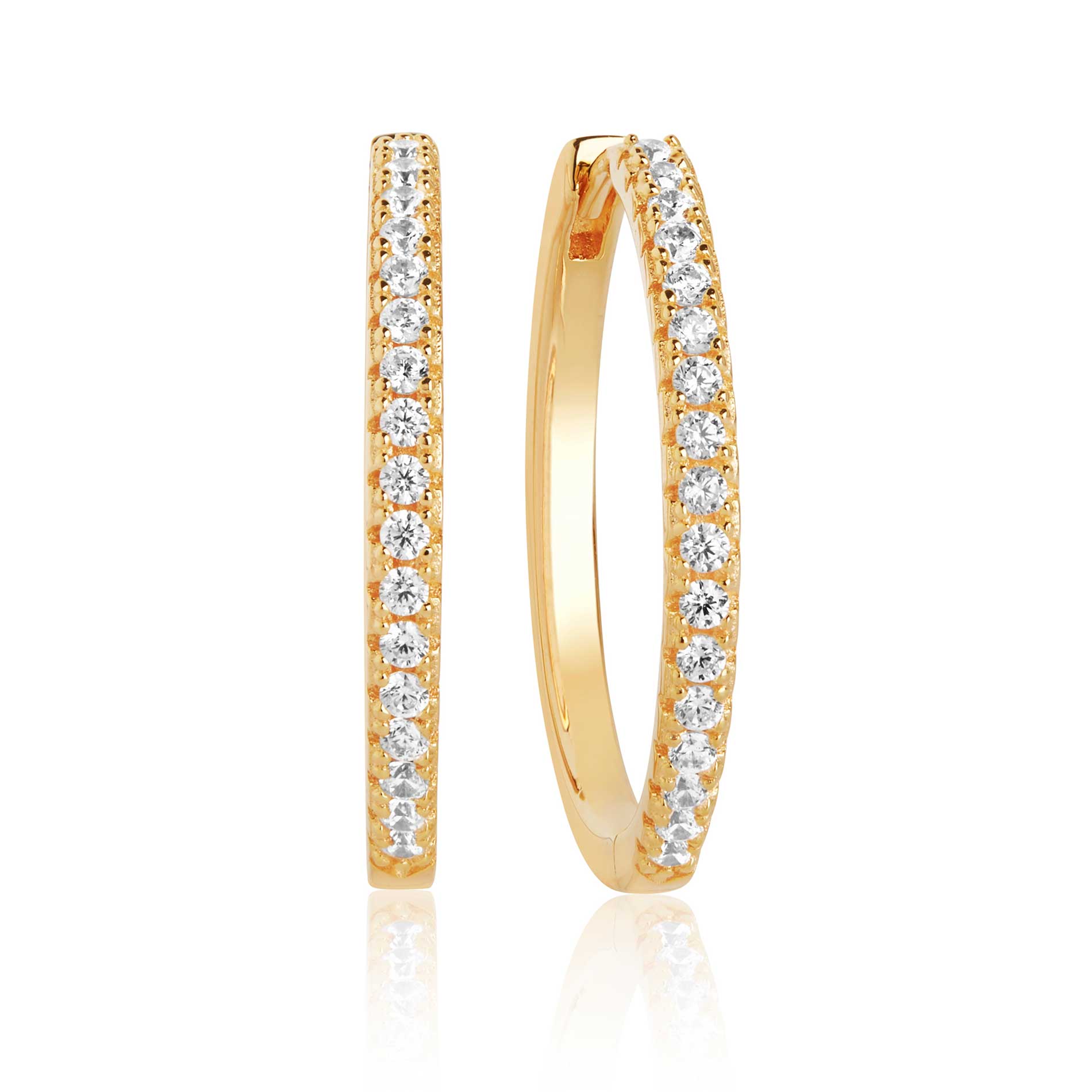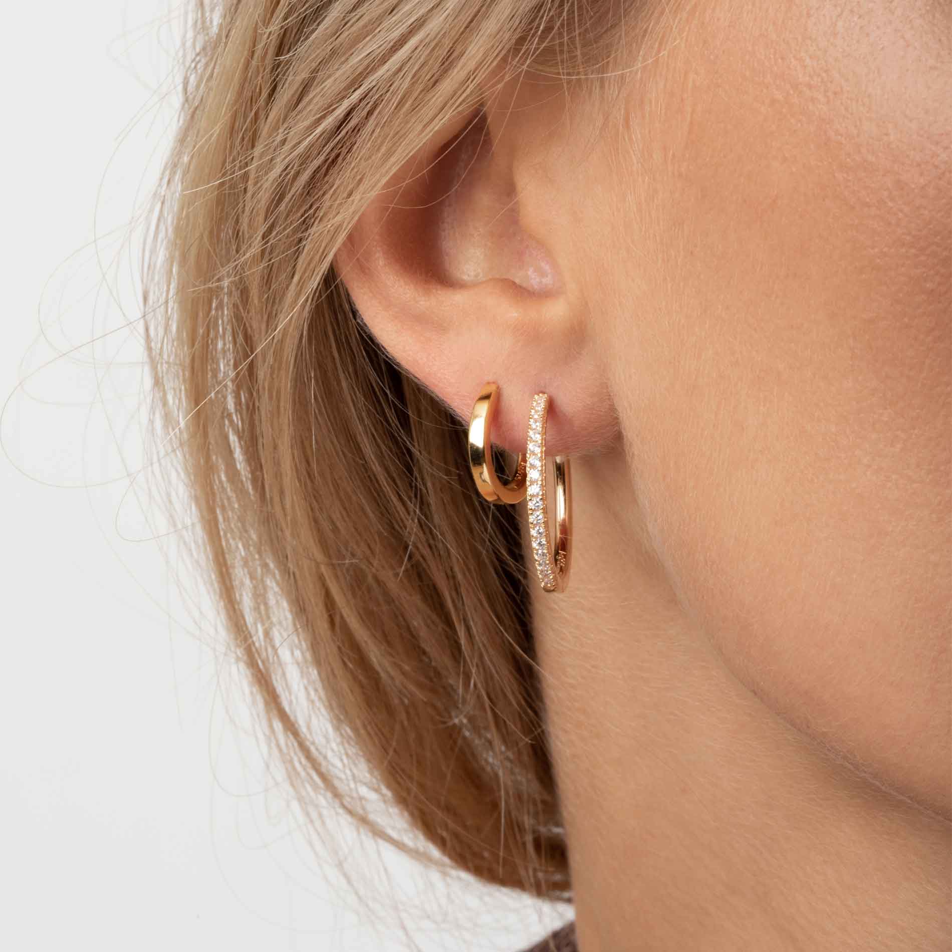 Disse forgyldte øreringe i 925 sterlingsølv udstråler en strålende skønhed og elegance. Med deres blankpolerede overflade og glitrende facetslebne hvide zirkonia, er disse øreringe det perfekte accessory til enhver lejlighed. De har en imponerende diameter på 24 mm, der tilføjer et strejf af luksus til dit look. Disse øreringe er en tidløs klassiker, der vil forblive en favorit i din smykkesamling.