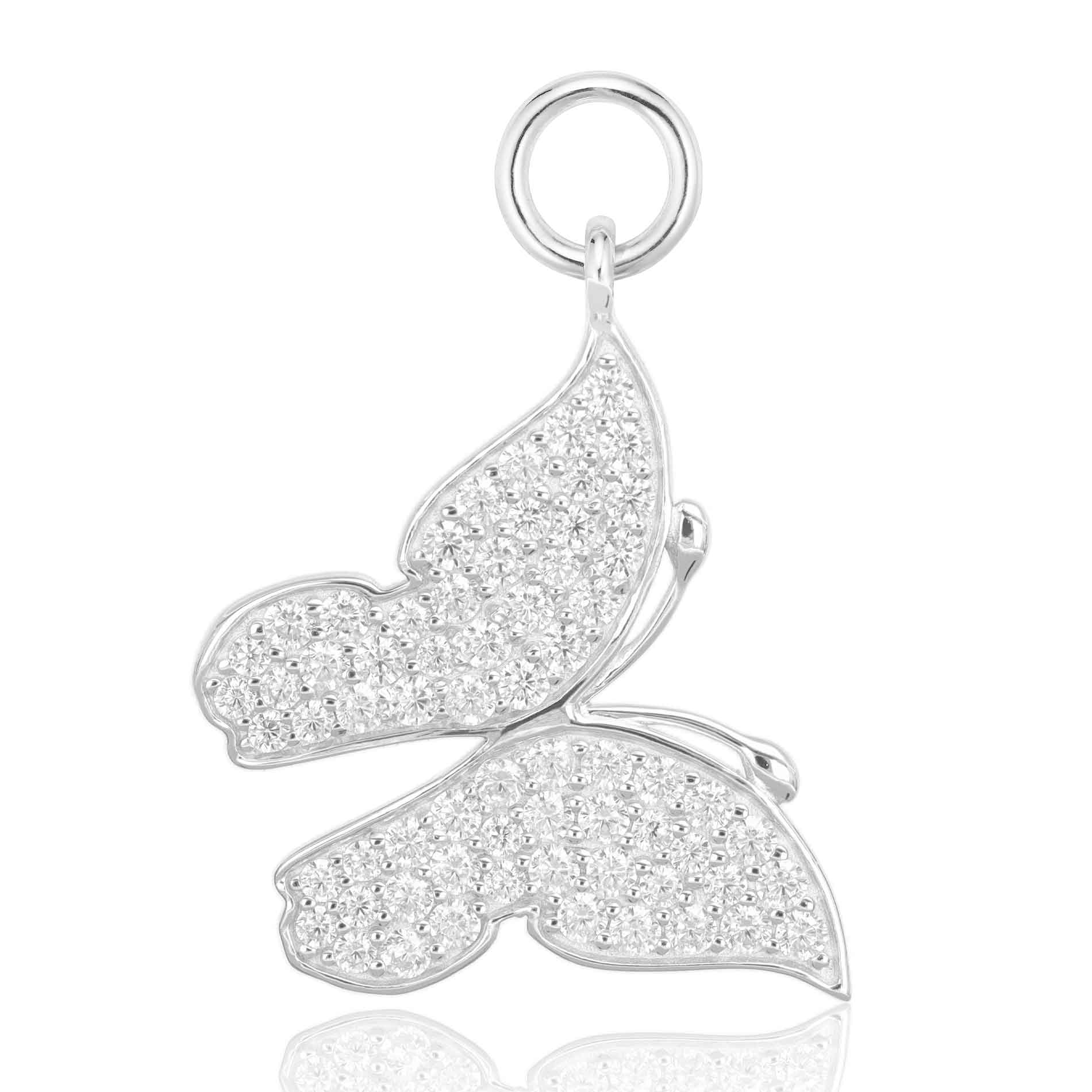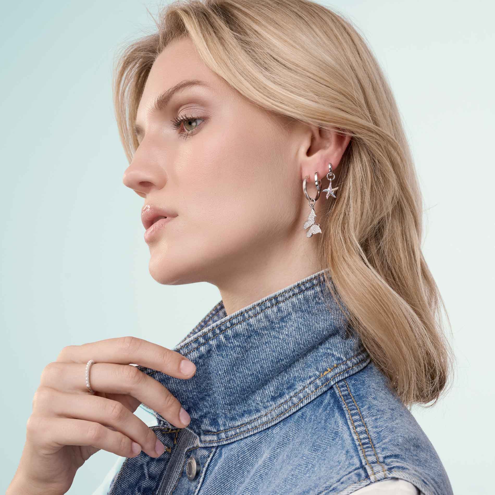 Tilføj et strejf af elegance og lethed til dine creoler med Sif Jakobs Farfalla Hoop Charm i sølv. Disse sommerfuglevedhæng er lavet af rhodineret 925 Sterling Sølv med en poleret overflade og håndsatte facetslebne hvide zirkonia, der skaber et subtilt glimt og en feminin flair.