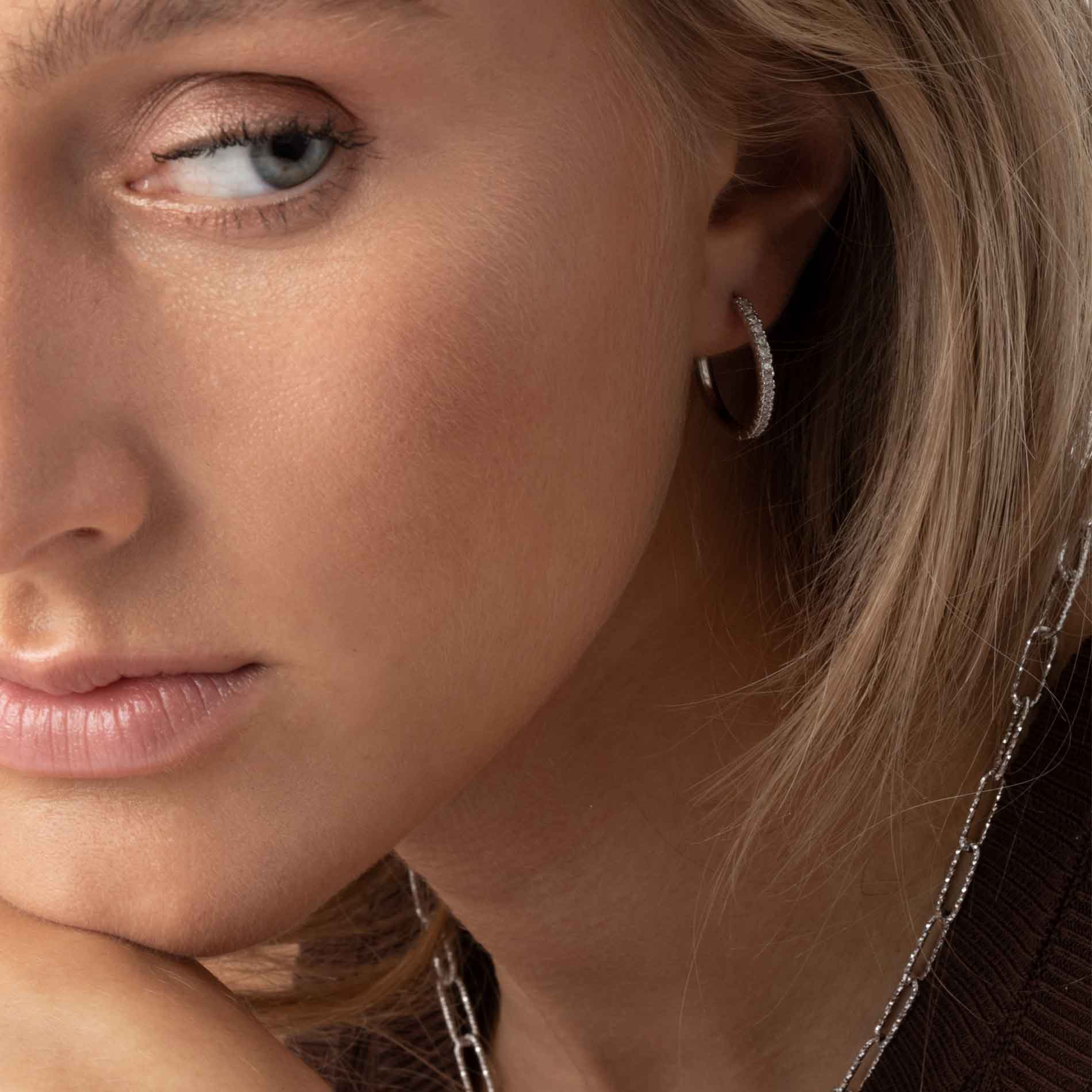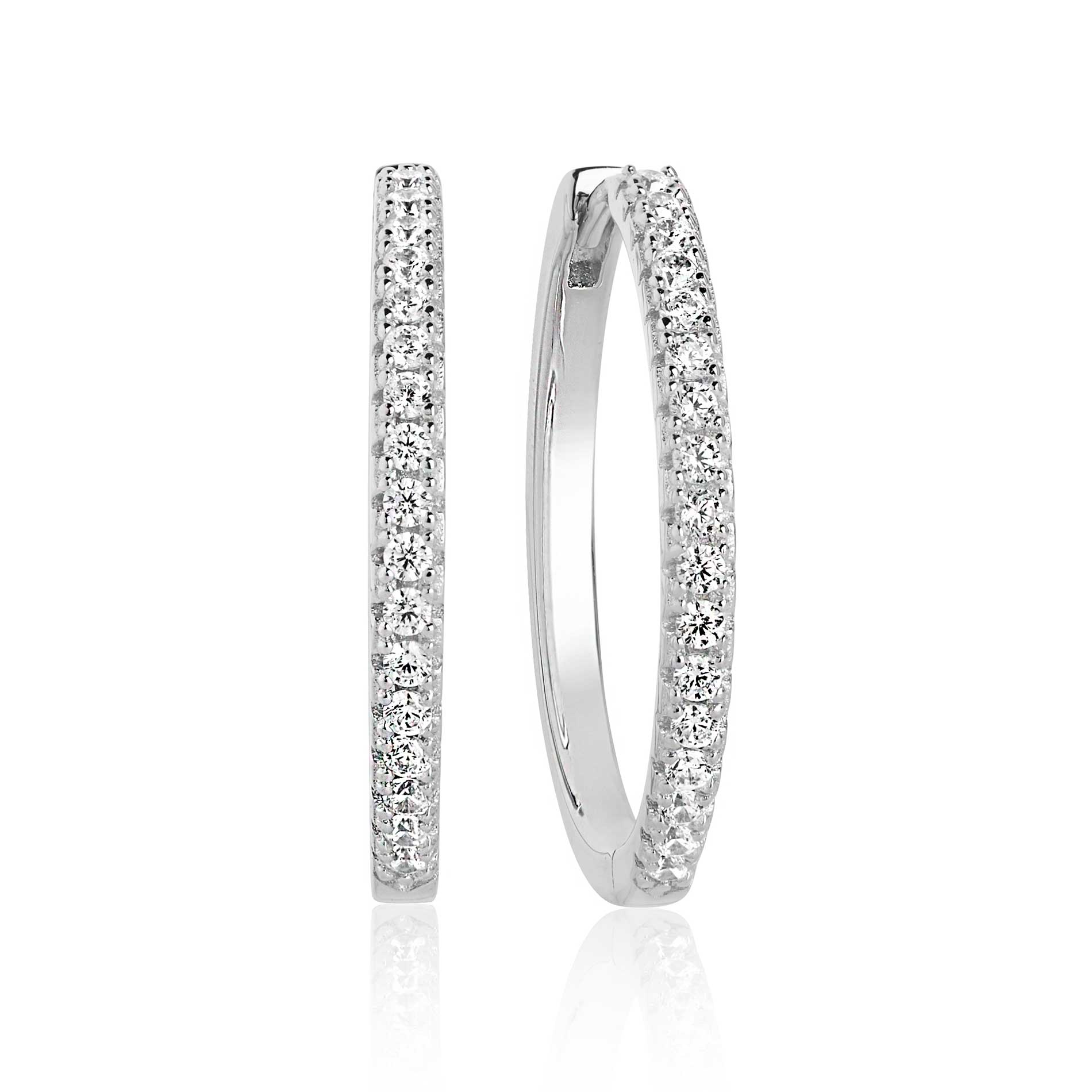 Disse øreringe i 925 sterlingsølv udstråler en strålende skønhed og elegance. Med deres blankpolerede overflade og glitrende facetslebne hvide zirkonia, er disse øreringe det perfekte accessory til enhver lejlighed. De har en imponerende diameter på 24 mm, der tilføjer et strejf af luksus til dit look. Disse øreringe er en tidløs klassiker, der vil forblive en favorit i din smykkesamling.