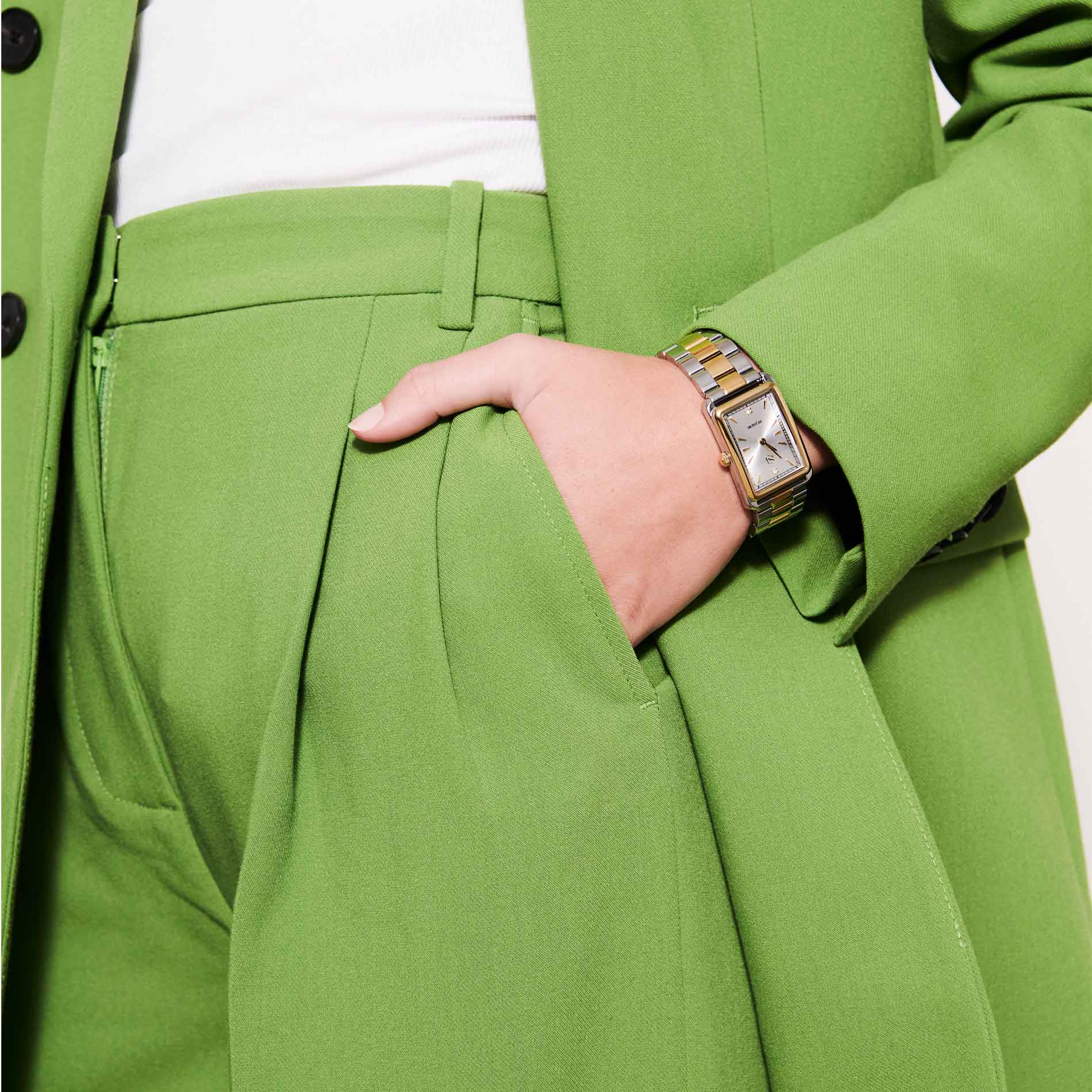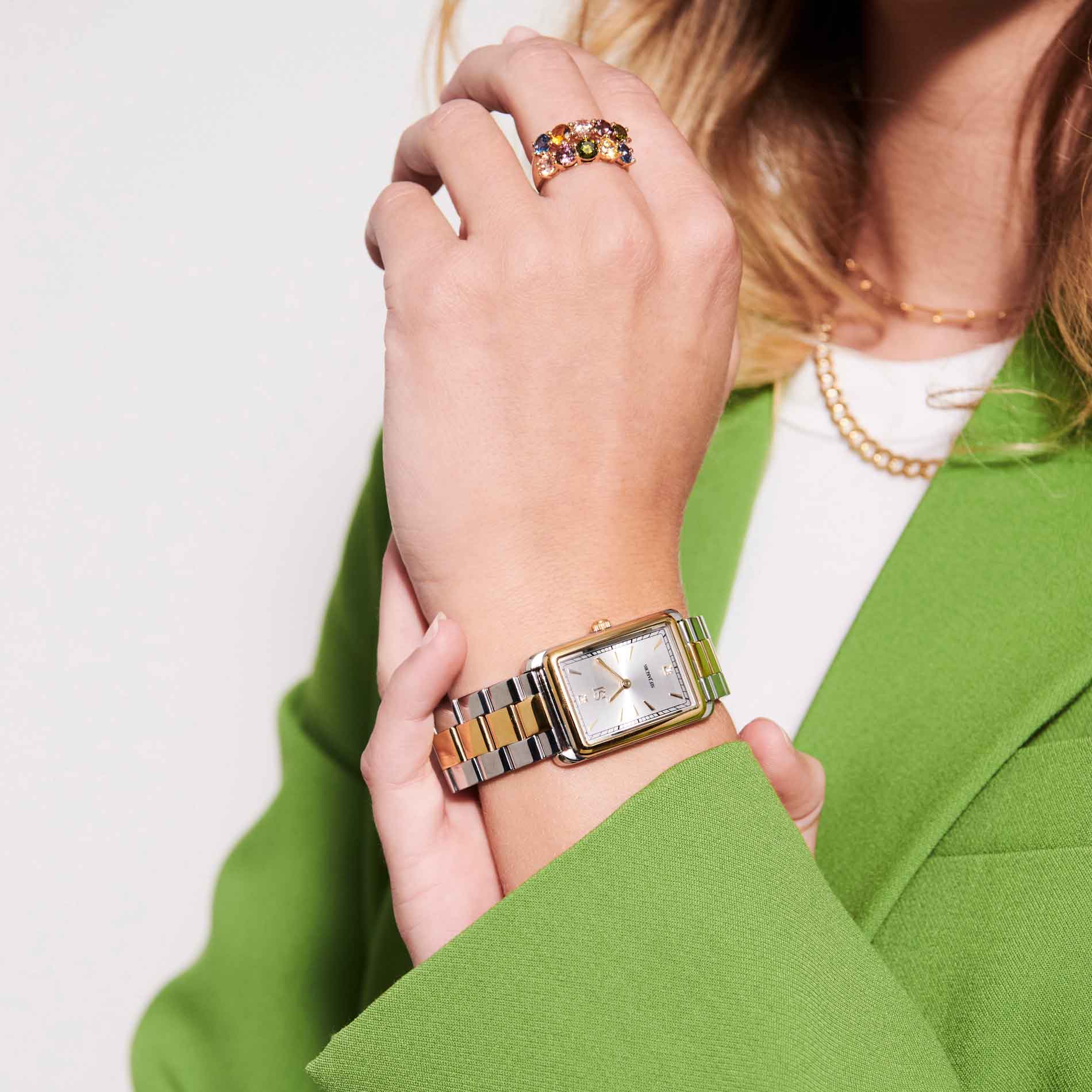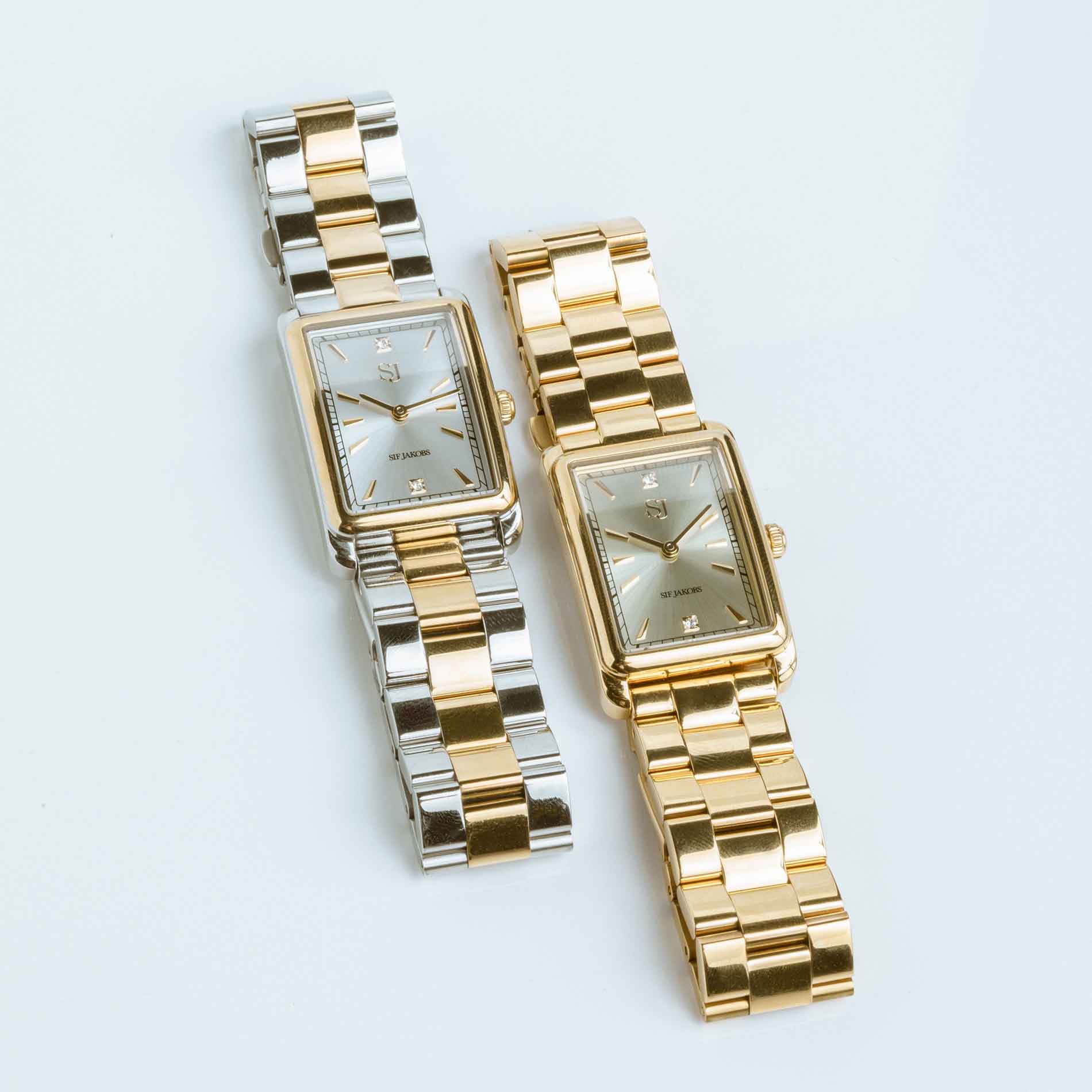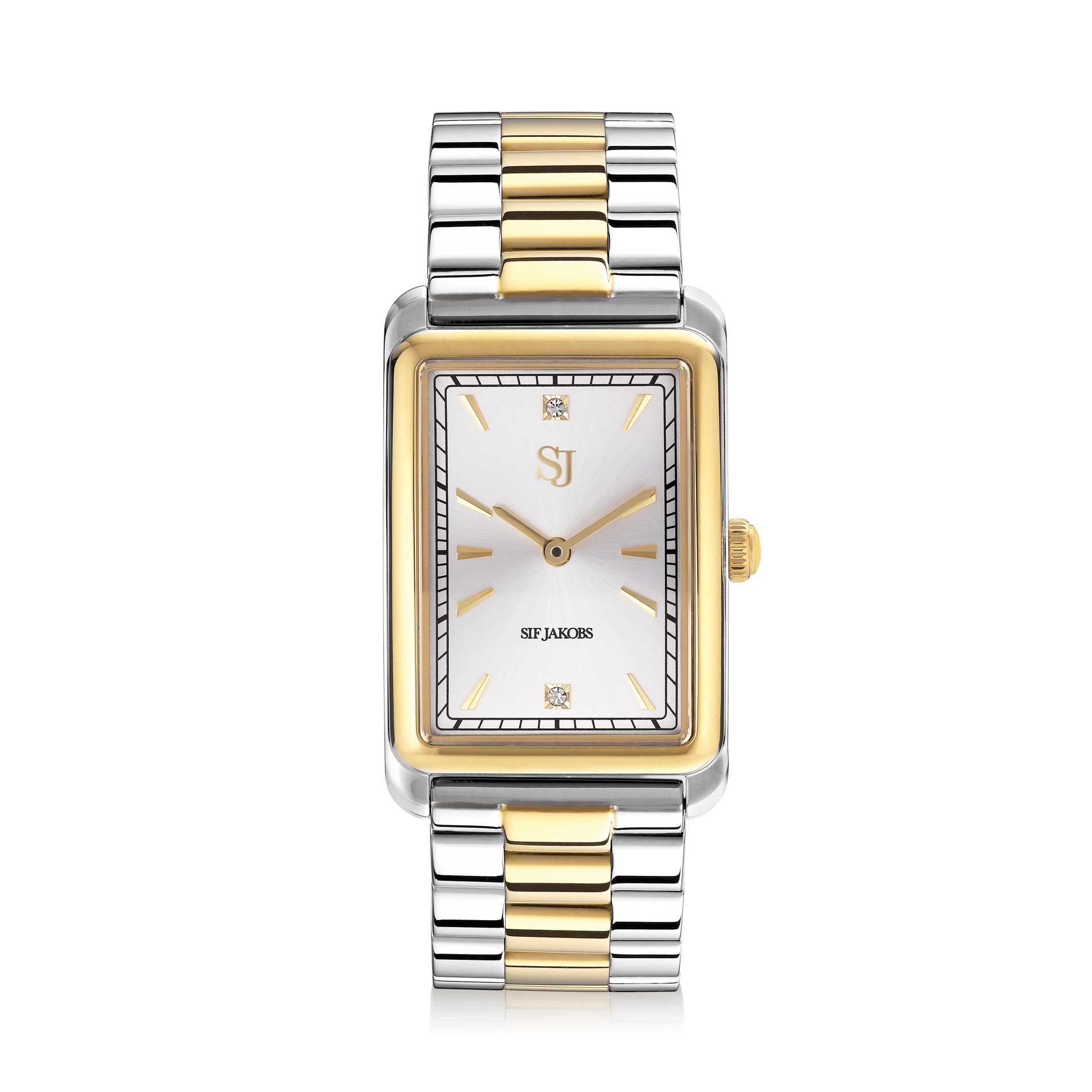 Dette Sif Jakobs ur som er fremstillet i et mix af guld tonet rustfrit stål og klassisk rustfrit stål, er et mesterværk af tidløs elegance. Med en poleret overflade, safirglas og smukke hvide zirkonia sten indlejret i en sølv metallisk urskive, skiller dette ur sig ud. Det er vandtæt ned til 30 meter og det japanske urværk sikrer pålidelig tidtagning og ydeevne.