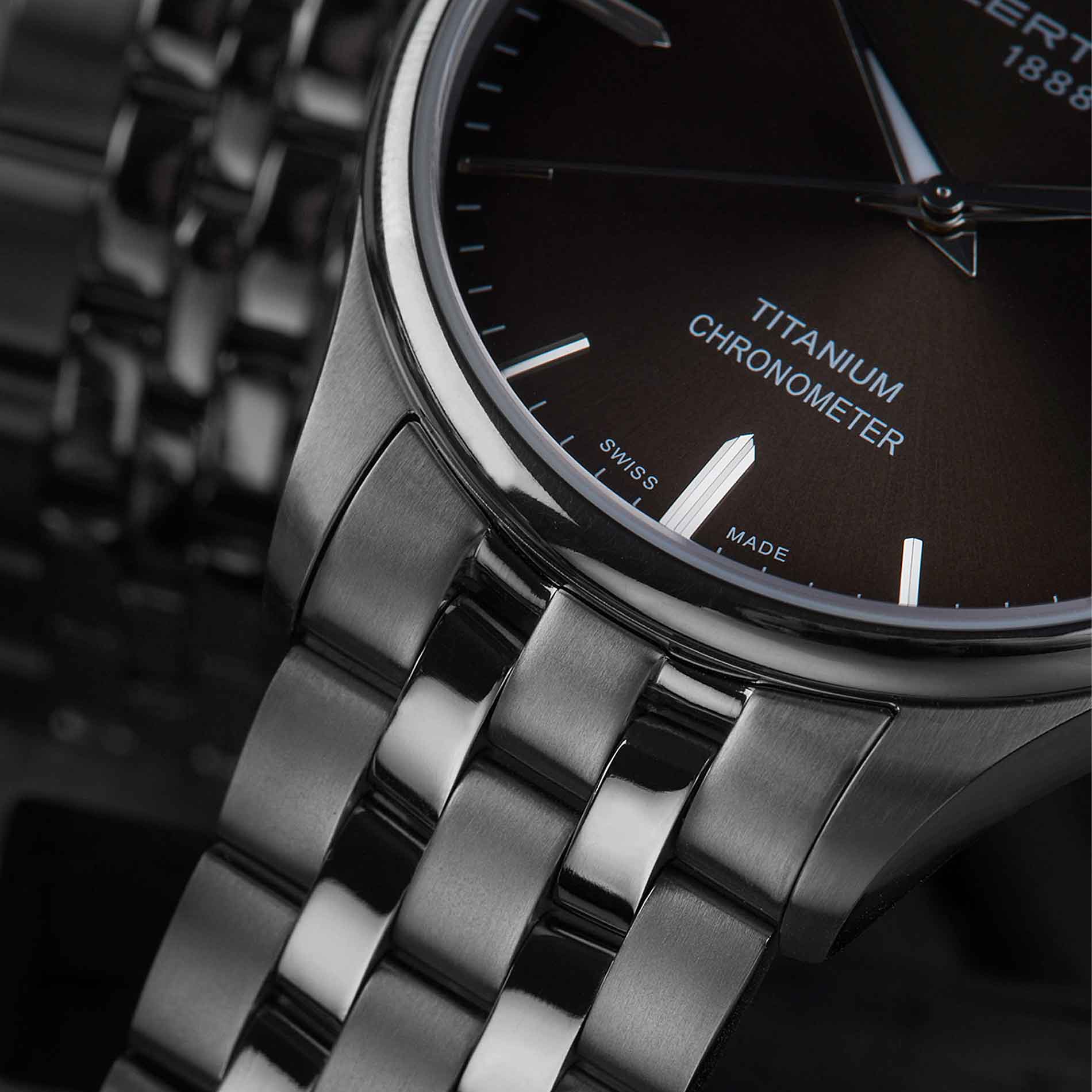 Den slanke profil med en tykkelse på blot 9 mm er behageligt elegant, samtidig med at det tilbyder en imponerende vandbeskyttelse på op til 10 ATM. Oplev tidens essens med Certina.