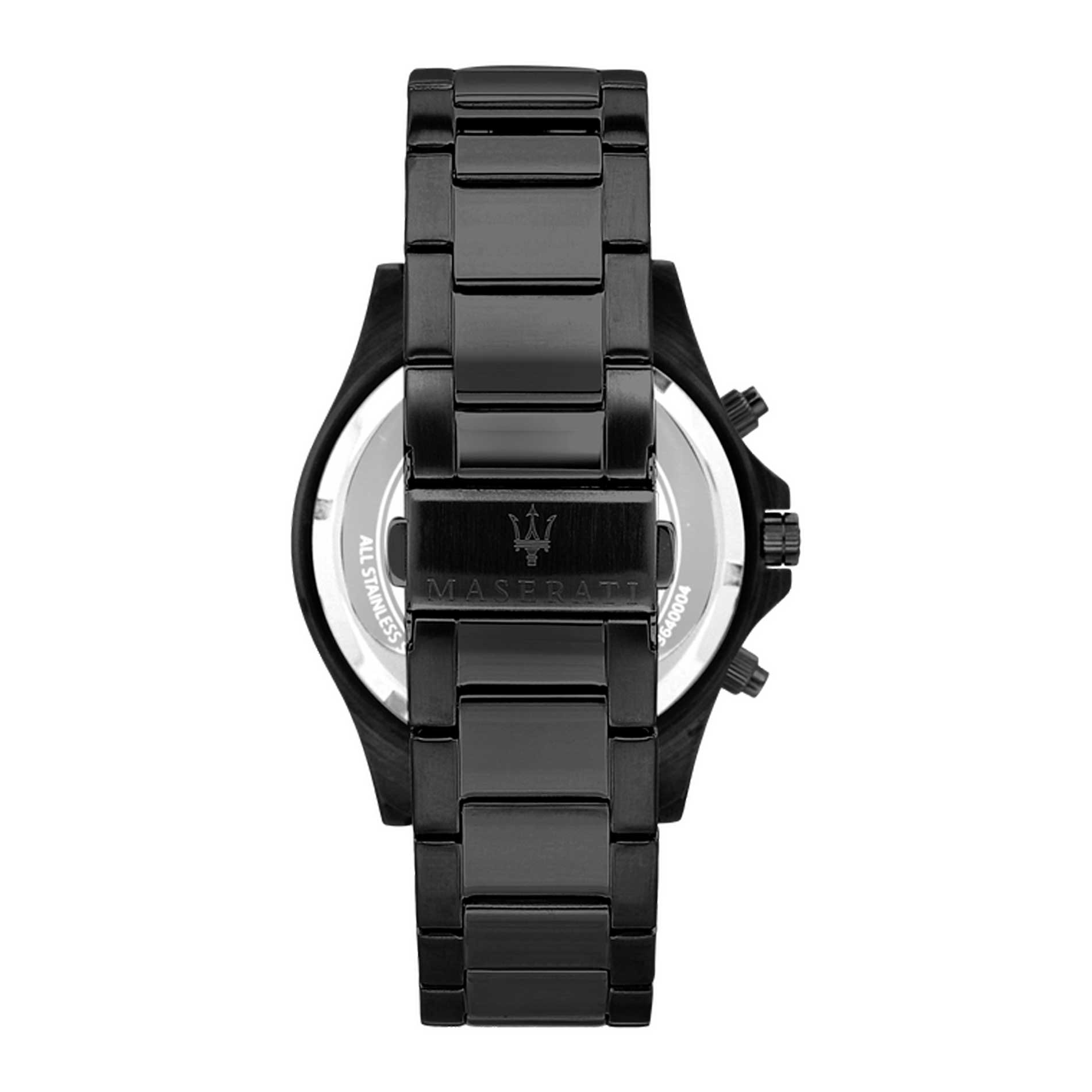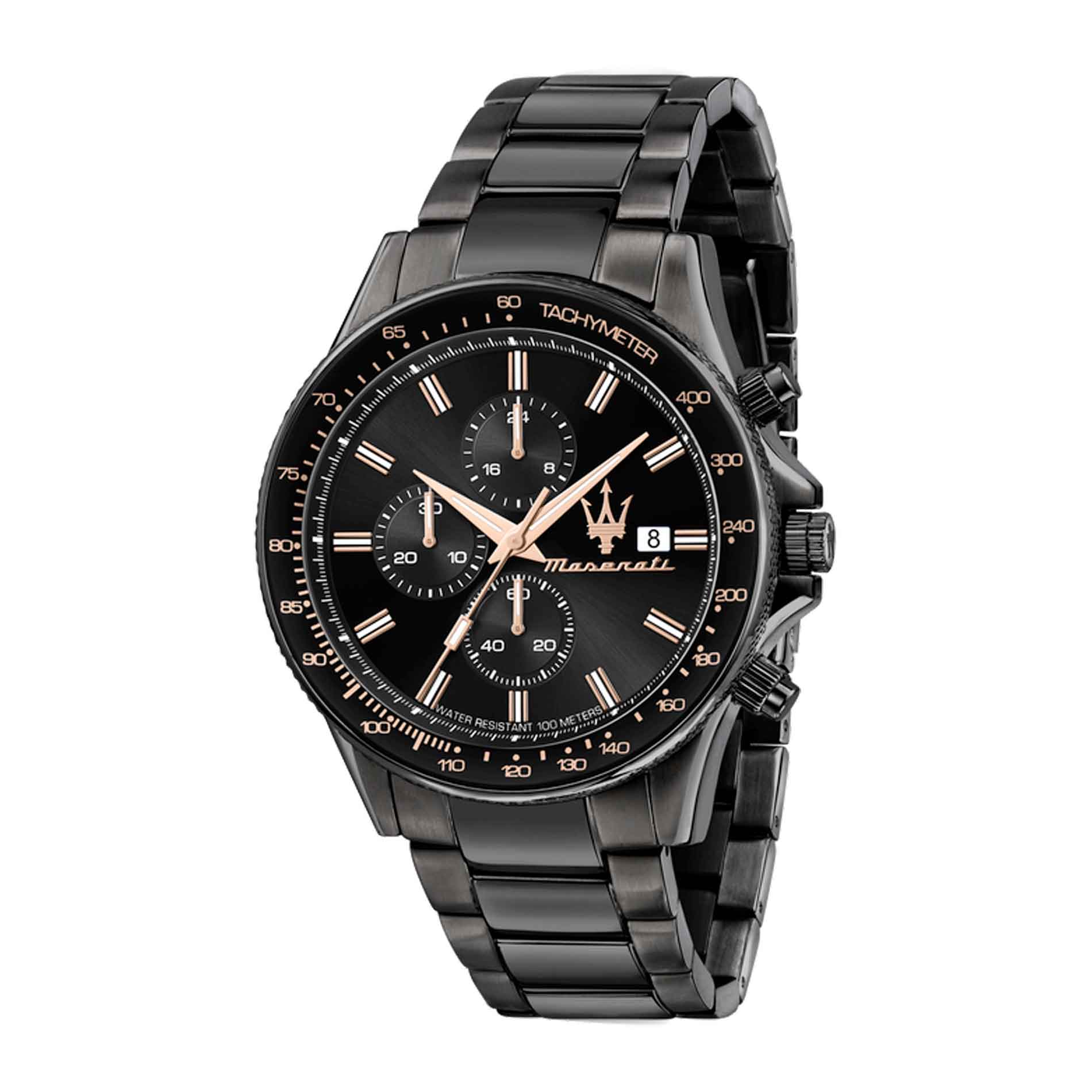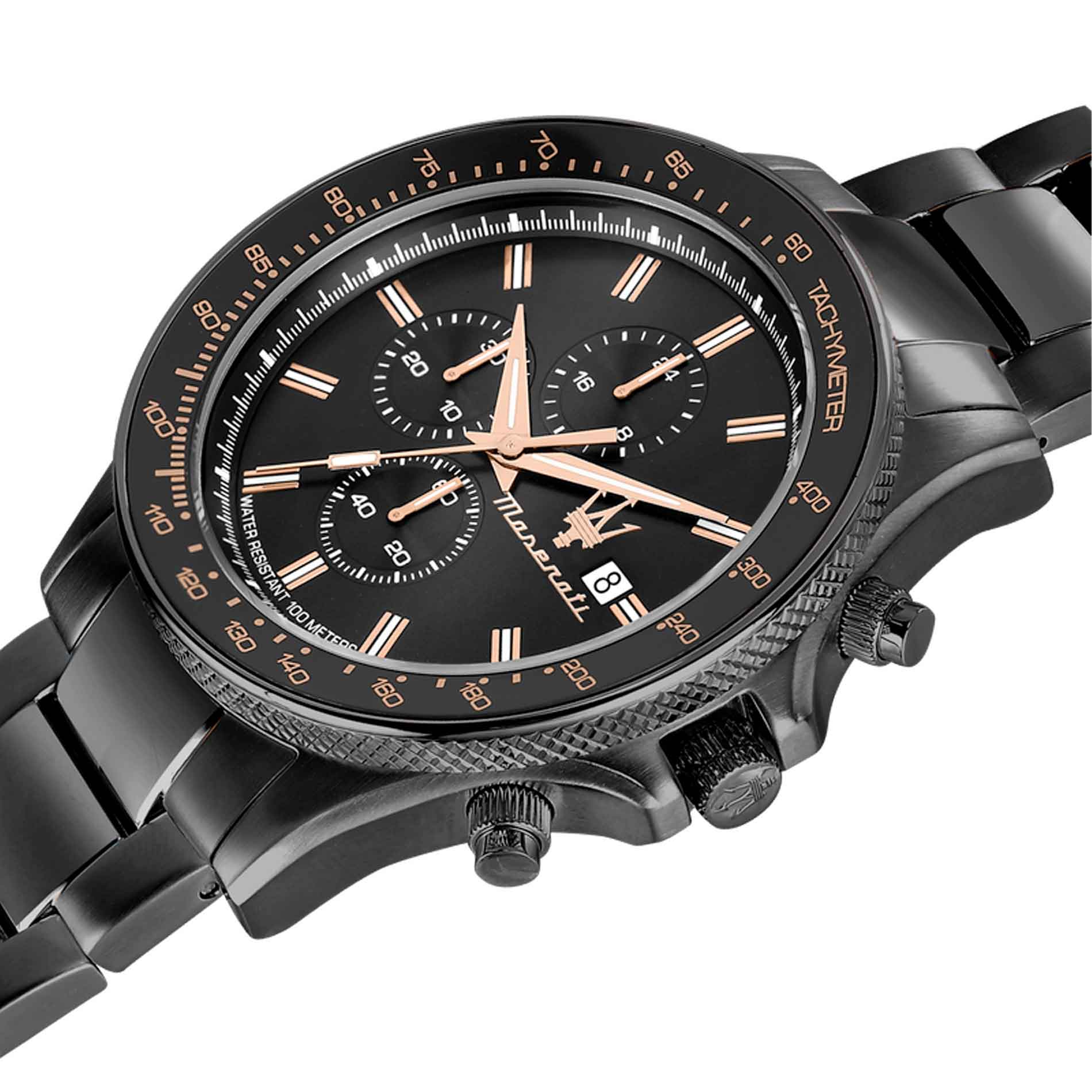 Maserati Sfida er et mesterværk af innovation og elegance.. Med et præcist kvartsurværk leverer uret pålidelig nøjagtighed. Den sorte urkasse, urskive, urkrans og lænke i rustfrit stål skaber en dyb og raffineret æstetik. Med en imponerende størrelse på 45 mm, en tykkelse på 11 mm og en rembredde på 22 mm tilbyder Maserati Sfida et robust og stilfuldt design. Vandbeskyttelse op til 10 ATM og mineralglas gør uret egnet til alle lejligheder. Funktioner som kronografer, datovisning, skruekrone, stopur og tachymeter tilføjer ekstra funktionalitet til dette imponerende ur.