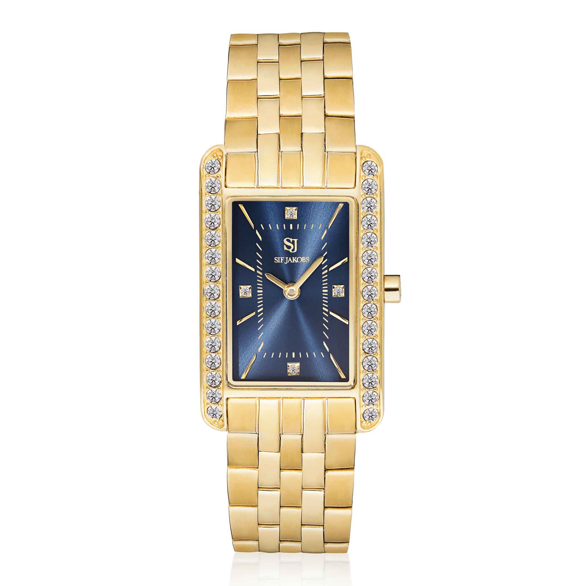 Dette Sif Jakobs ur som er fremstillet i forgyldt rustfrit stål, er et mesterværk af tidløs elegance. Med en poleret overflade, safirglas og smukke hvide zirkonia indlejret i en mørk blå urskive, skiller dette ur sig ud. Det er vandtæt ned til 30 meter og det japanske urværk sikrer pålidelig tidtagning og ydeevne.