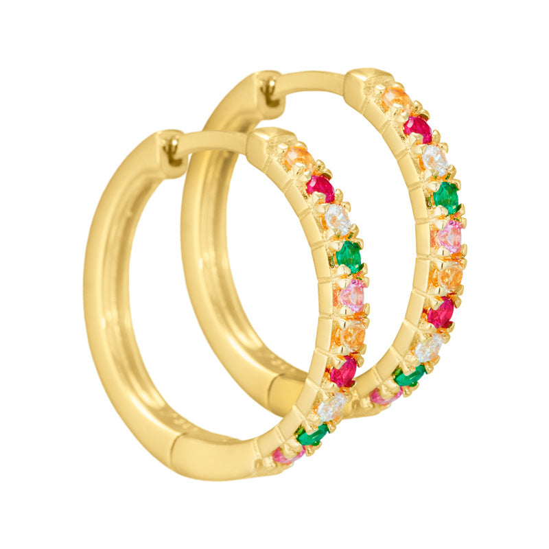 Disse smukke 20 mm creoler i forgyldt sterling sølv er den ultimative måde at tilføre elegance og farve til din smykkesamling. De er smukt udsmykket med multifarvede Zirkonia-sten, der skaber et subtilt og strålende udtryk. Disse øreringe er perfekte til enhver lejlighed og vil tilføre et strejf af glamour til dit look.