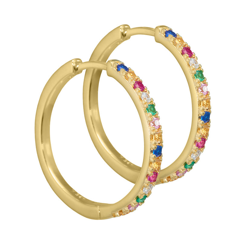 Disse smukke 25 mm creoler i forgyldt sterling sølv er den ultimative måde at tilføre elegance og farve til din smykkesamling. De er smukt udsmykket med multifarvede Zirkonia-sten, der skaber et subtilt og strålende udtryk. Disse øreringe er perfekte til enhver lejlighed og vil tilføre et strejf af glamour til dit look.