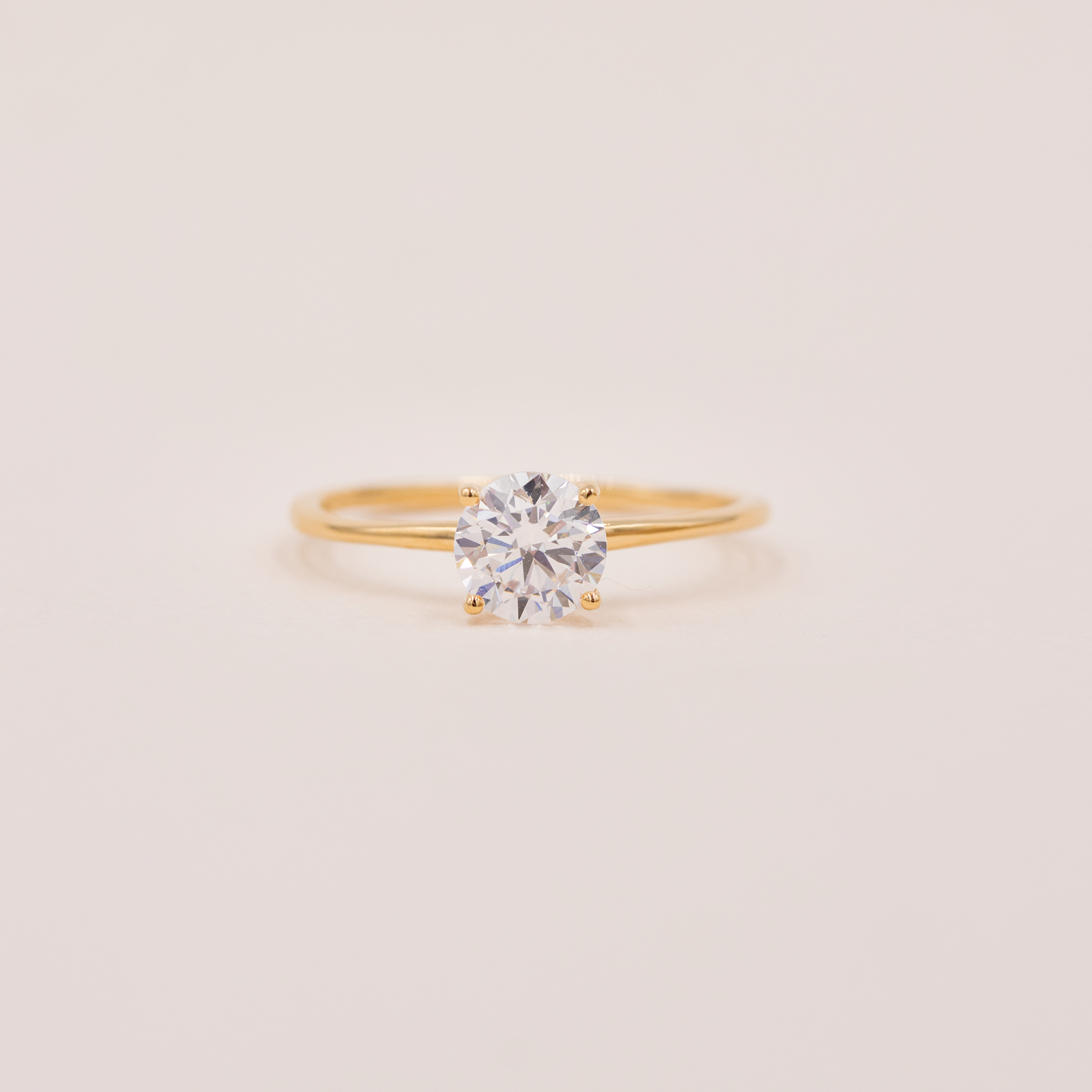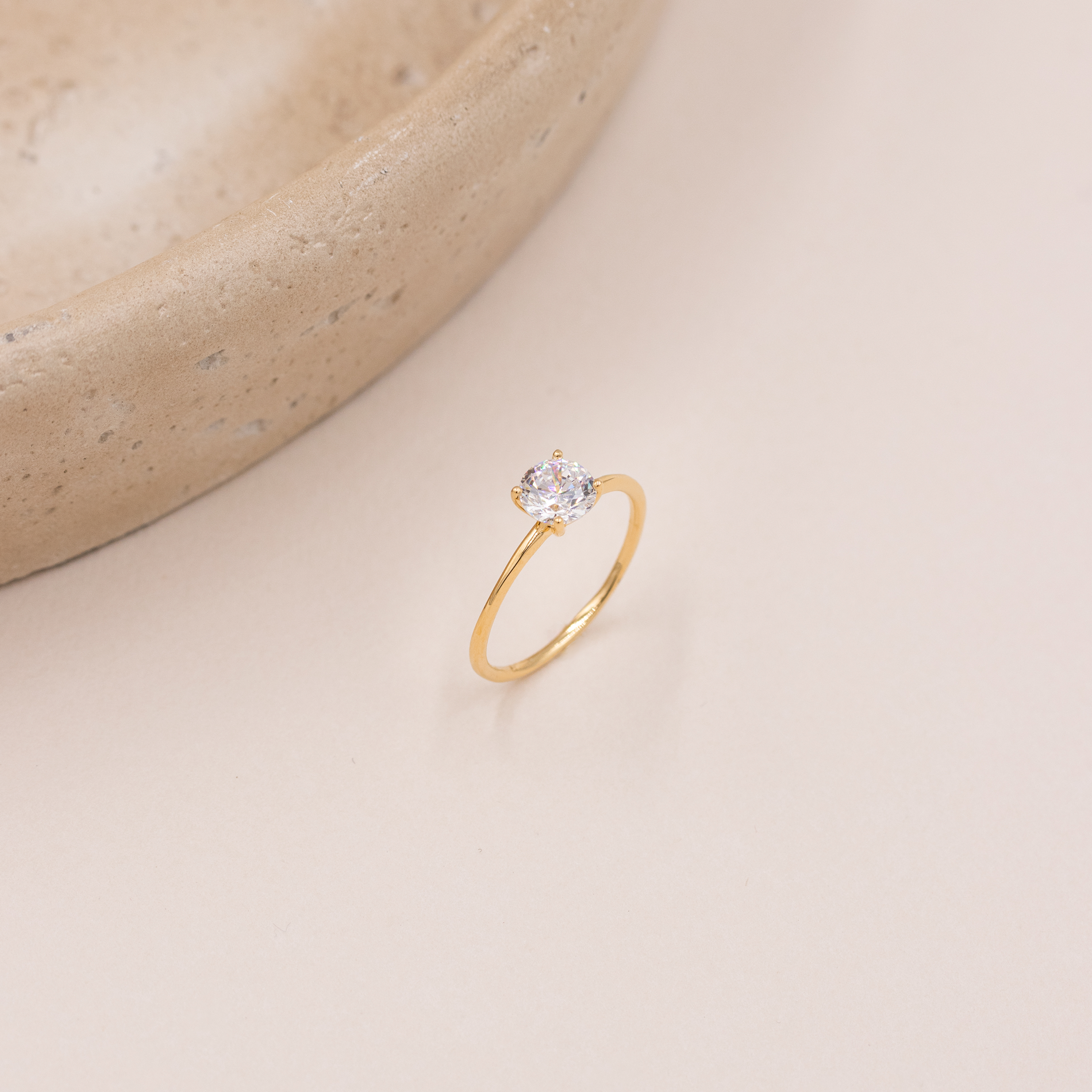 Amar ring er en klassisk solitaire-ring med et rent og harmonisk udtryk. Den funklende zirkonia er løftet i en enkel fatning, der giver stenen maksimal lysindfald og fremhæver dens klare brillans.