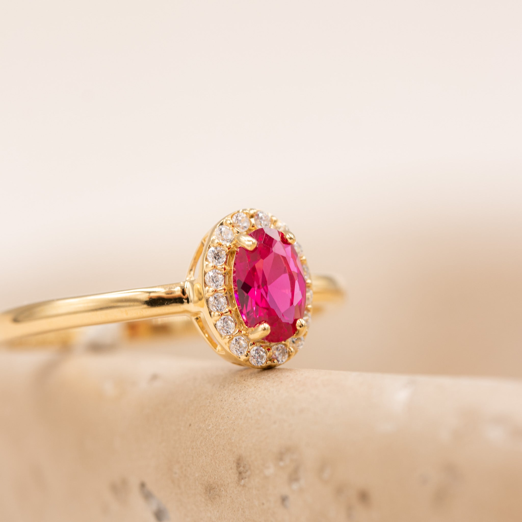 Den varme forgyldning fremhæver stenens farve og giver ringen et eksklusivt og tidløst udtryk. Elina Ruby er smuk alene og oplagt at kombinere med andre ringe for et personligt look – perfekt til både hverdag og særlige øjeblikke.