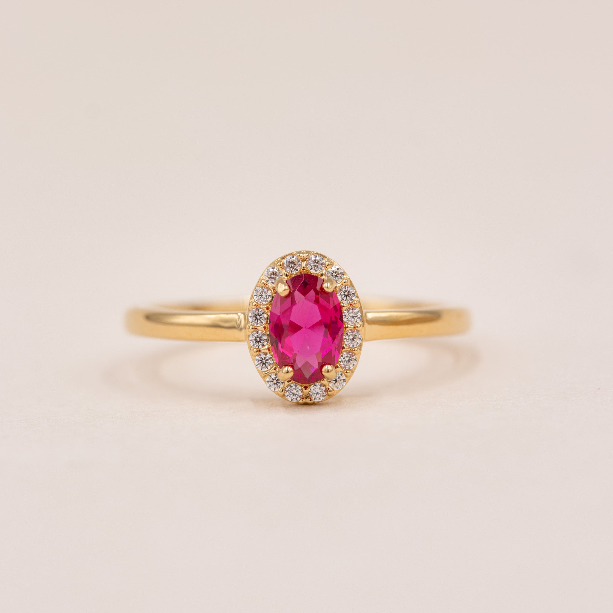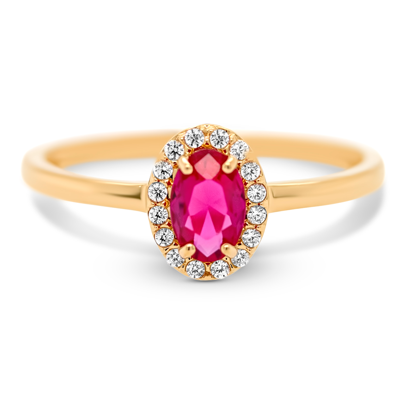 Elina Ruby roset ring i forgyldt sølv er en klassisk og feminin ring med et levende rubinrødt udtryk. Den ovale zirkonia i midten er indrammet af en fin krans af klare zirkonia, som tilfører dybde og en elegant glans.